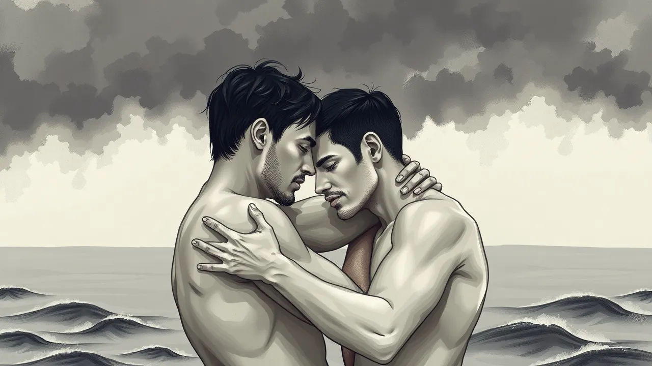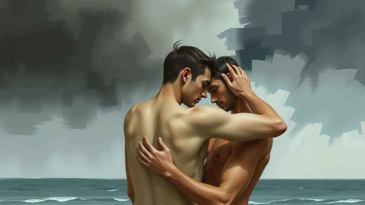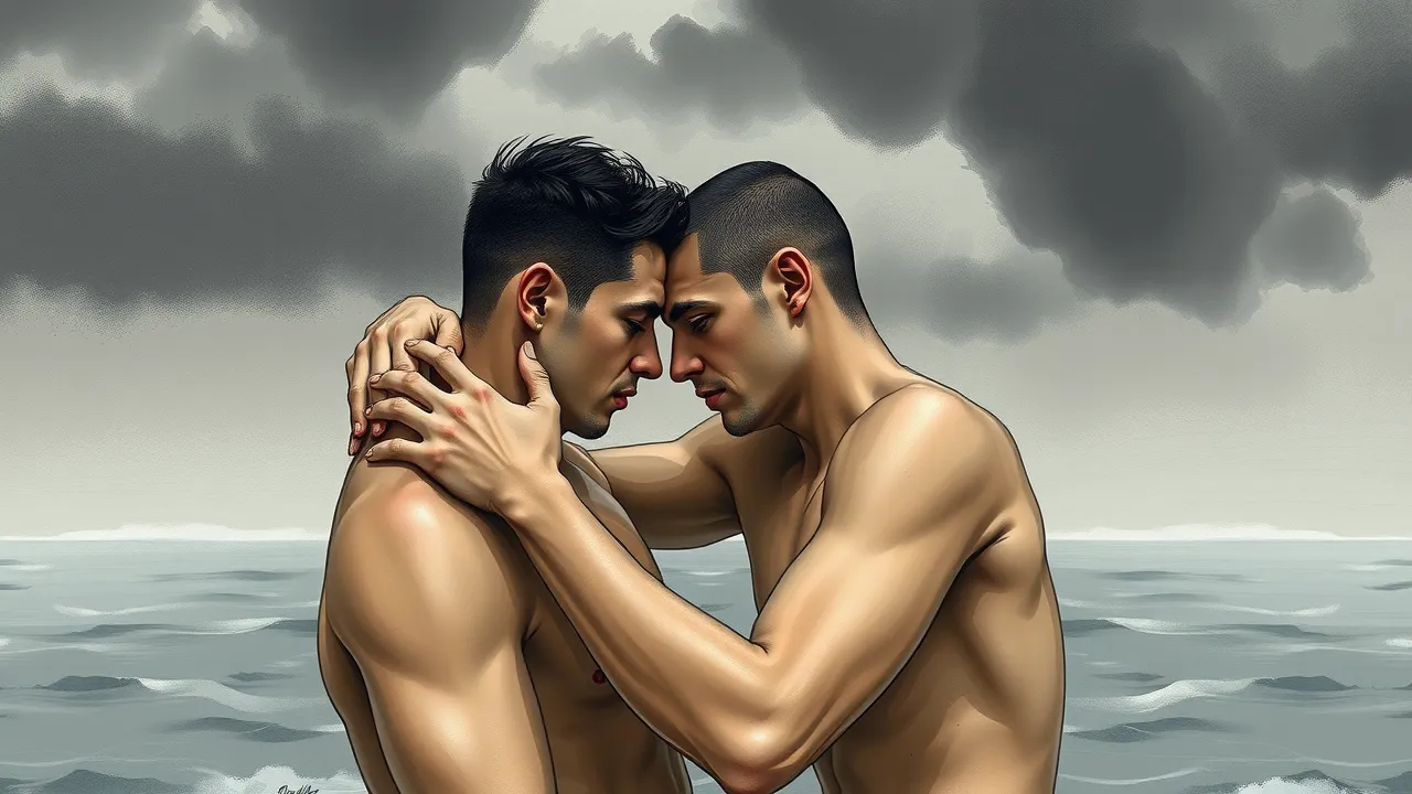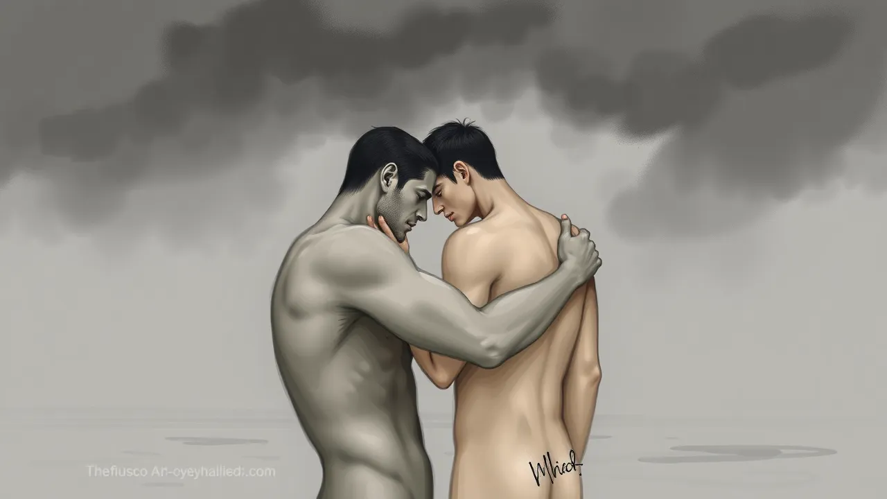 Two shirtless men hugging closely, their foreheads touching intimately. The scene is rendered in muted gray tones, with dark, stormy clouds overhead. Subtle brushstrokes create a sense of movement and emotion, enhancing the connection between the figures. The background features gentle waves, adding to the overall atmospheric tension of the piece.