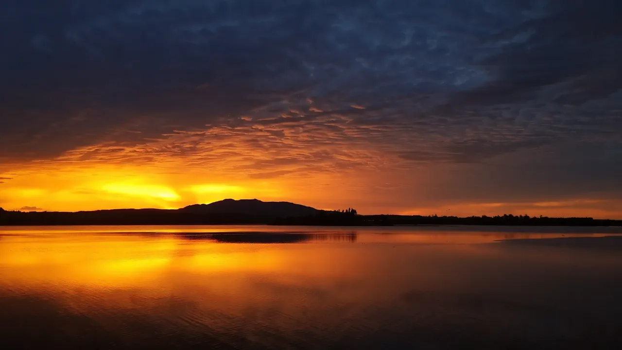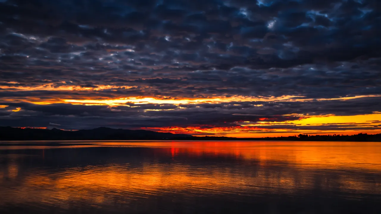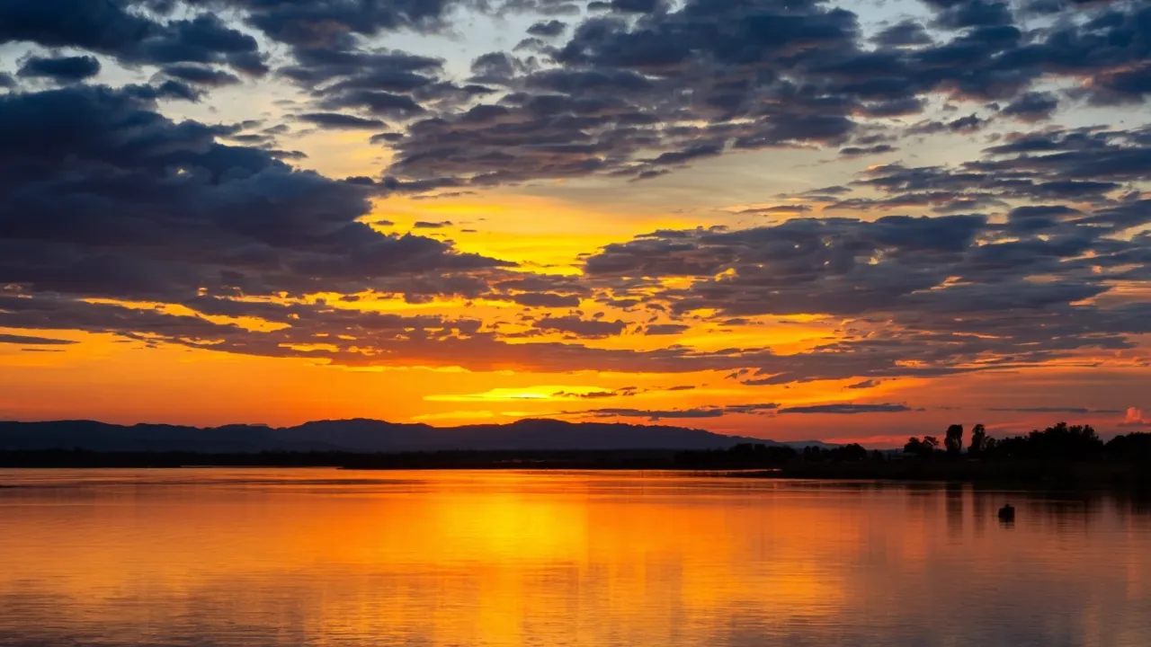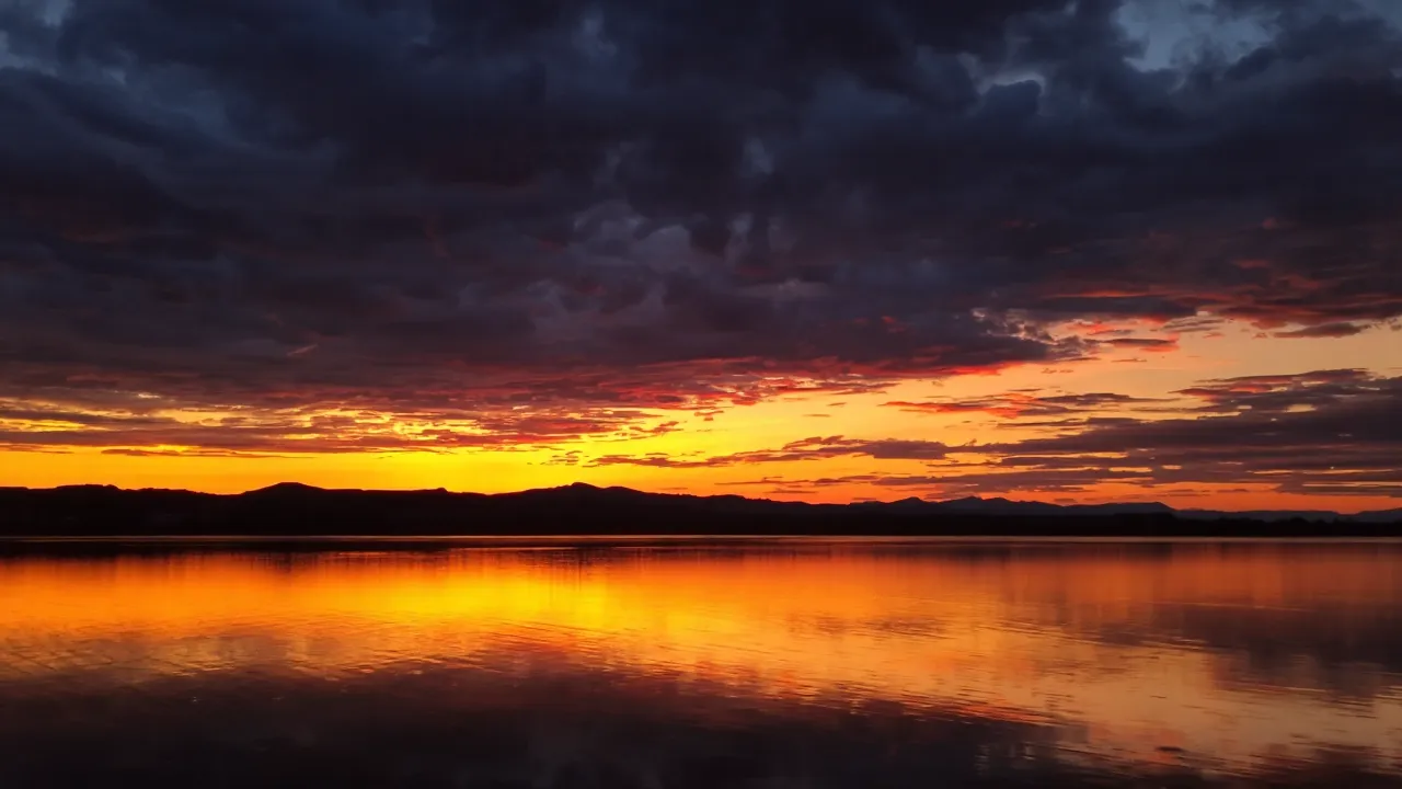 A tranquil sunset landscape, featuring a still body of water reflecting vibrant oranges and yellows, juxtaposed with a dramatic sky filled with dark, textured clouds. Mountain silhouettes can be seen in the distance, and a small silhouette of trees can be seen on the horizon. The scene conveys a serene atmosphere.