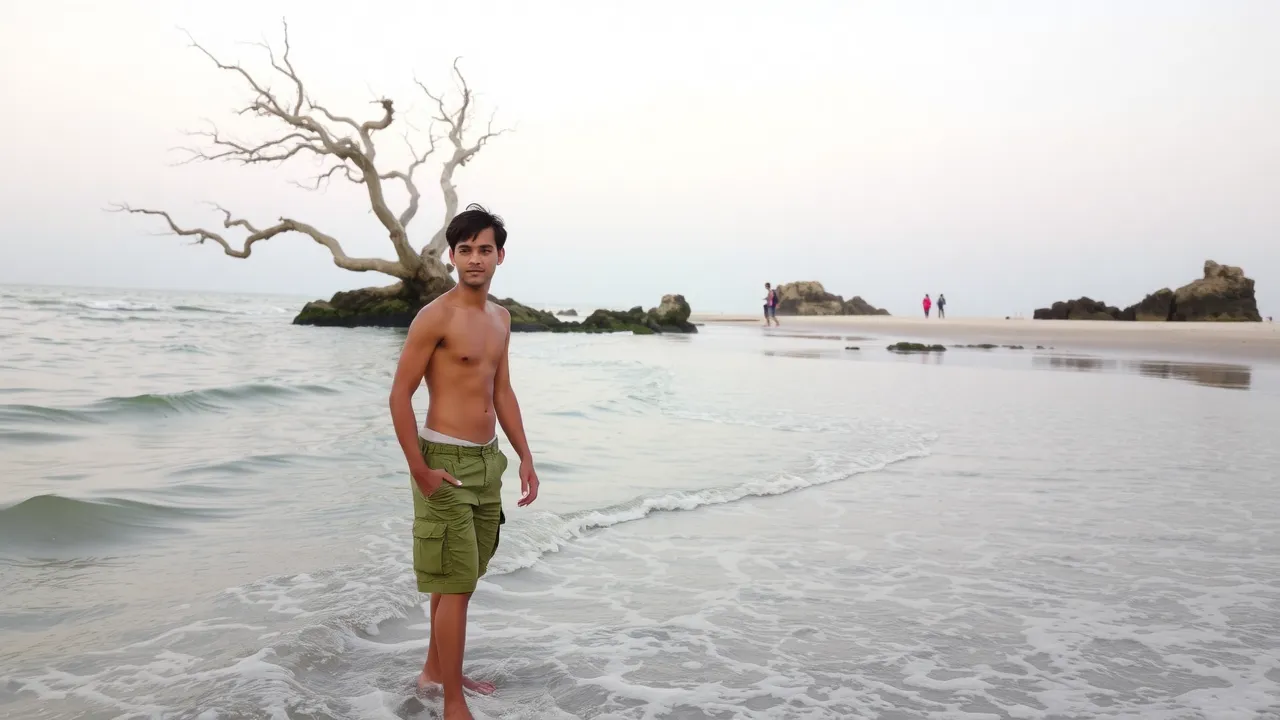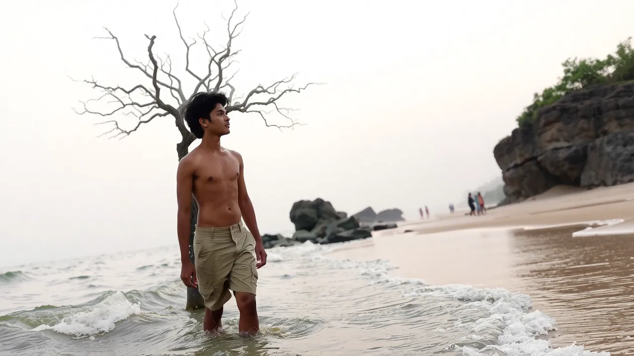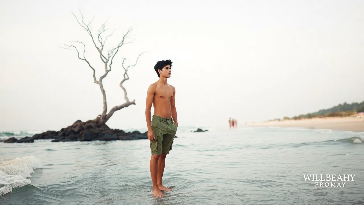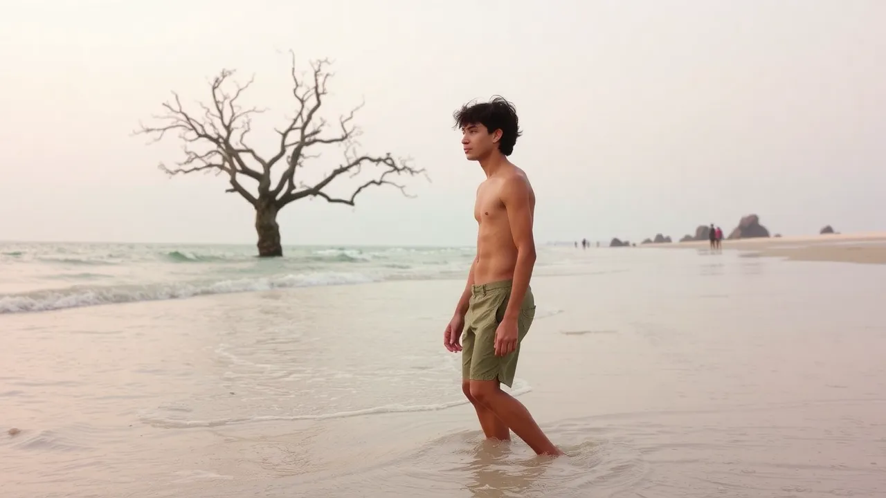 A young man stands at the water’s edge, barefoot in shallow waves, gazing toward the horizon. He is shirtless, wearing khaki shorts, his hair disheveled, and his expression contemplative. In the background, a lone tree with sparse leaves and twisted branches rises against a soft, pastel sky. Rock formations dot the sandy beach, while distant figures stroll along the shoreline. The scene conveys a serene and reflective atmosphere.