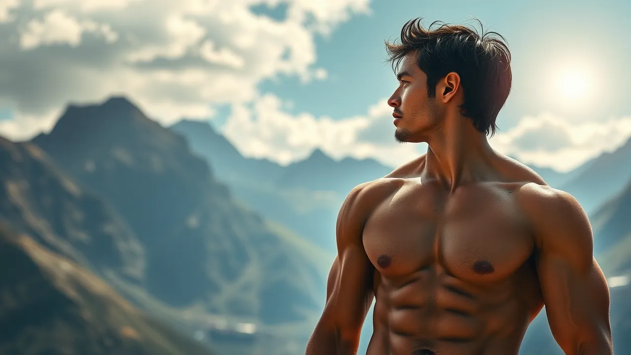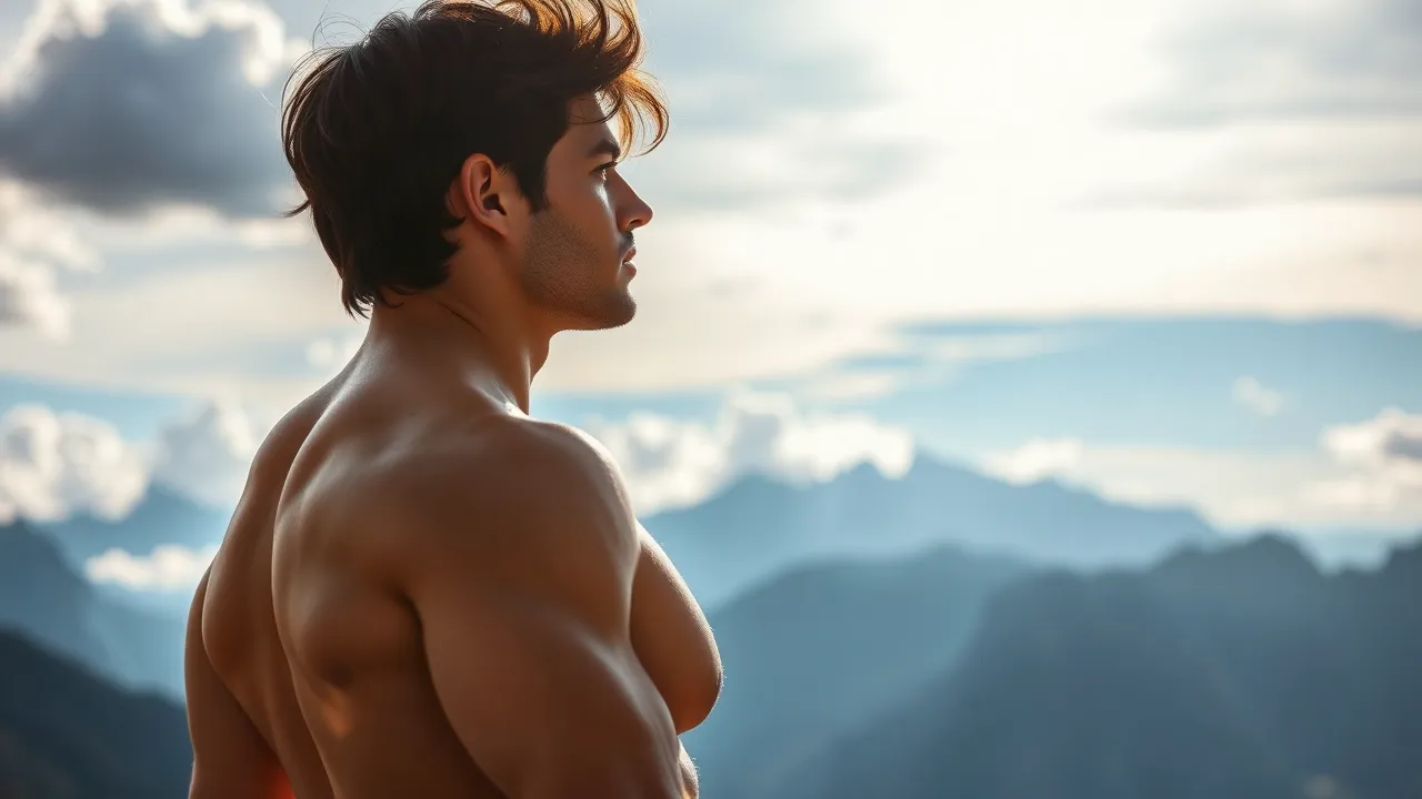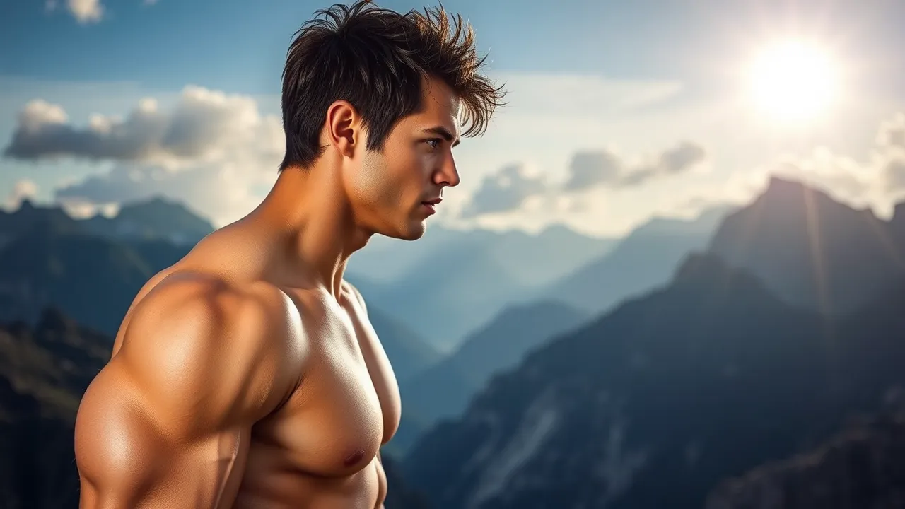 A muscular man in profile, his gaze directed toward the horizon. He has disheveled dark hair and is shirtless, revealing well-defined abs. The background features a spectacular mountain landscape, against a sky with a bright sun and clouds.