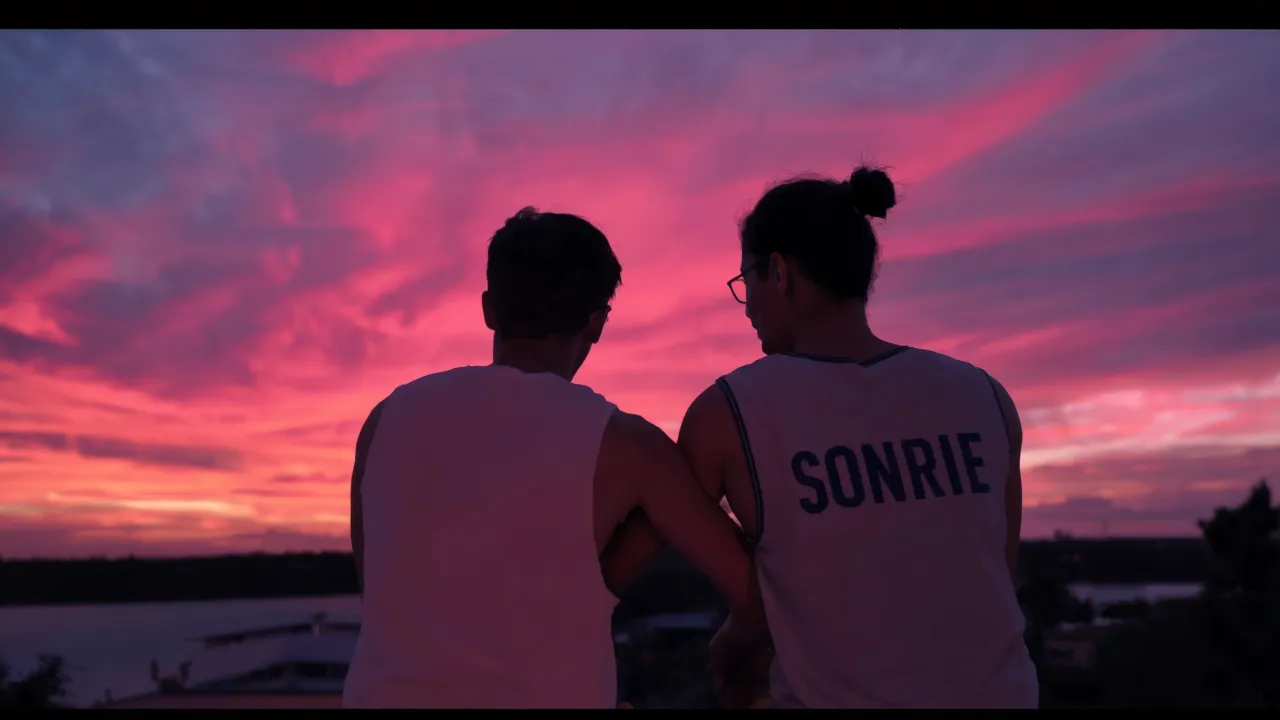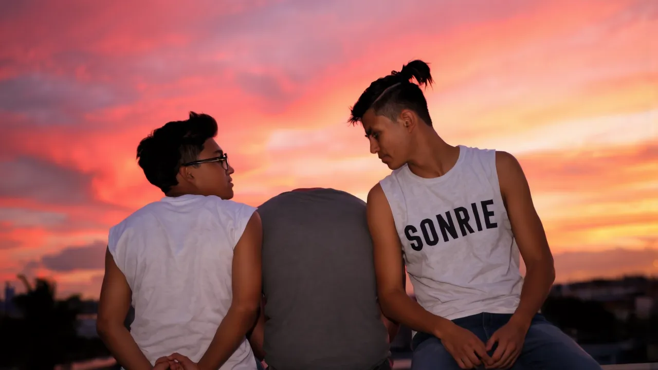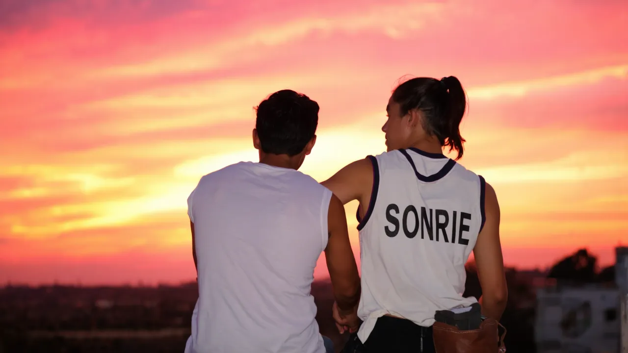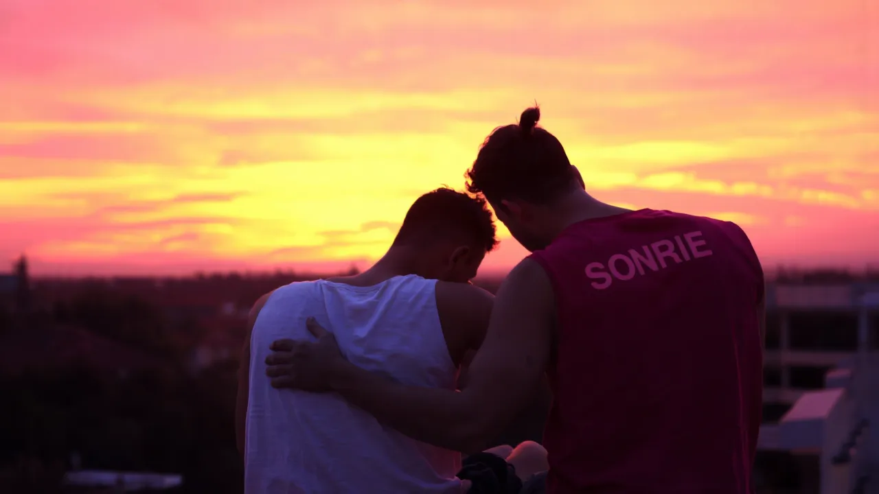 Two young men sit together on a ledge, gazing at a vibrant sunset with pink and orange hues. The one on the left wears glasses and a simple white sleeveless T-shirt, his expression thoughtful. The one on the right, with a ponytail, wears a sleeveless T-shirt emblazoned with the word SONRIE and leans slightly closer, sharing a moment of camaraderie. Their arms gently touch, suggesting support and connection with the stunning sky in the background.