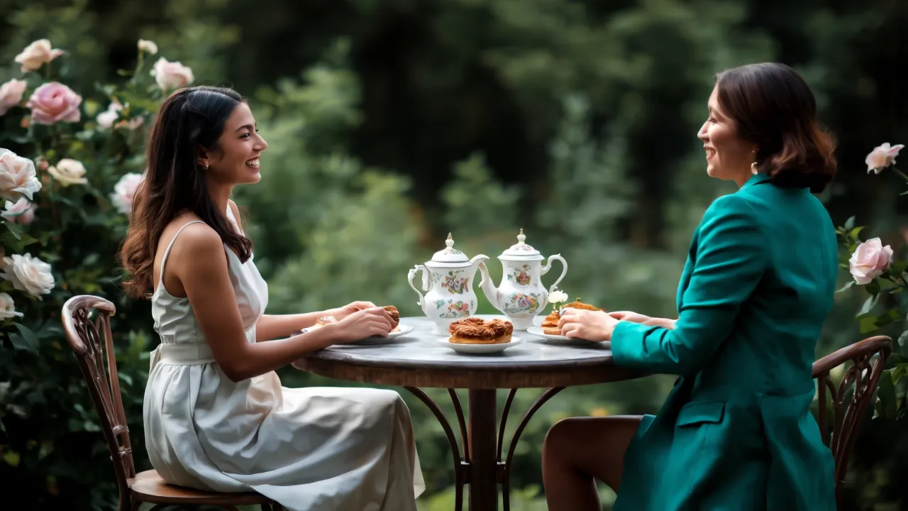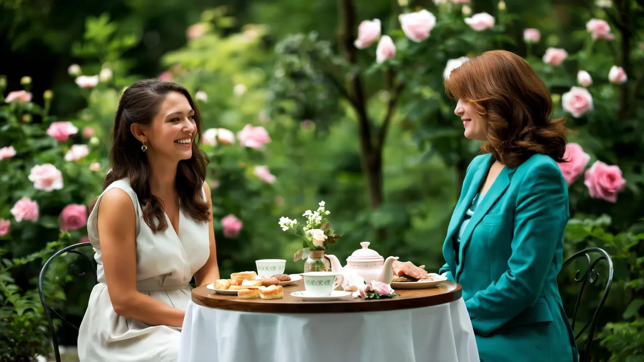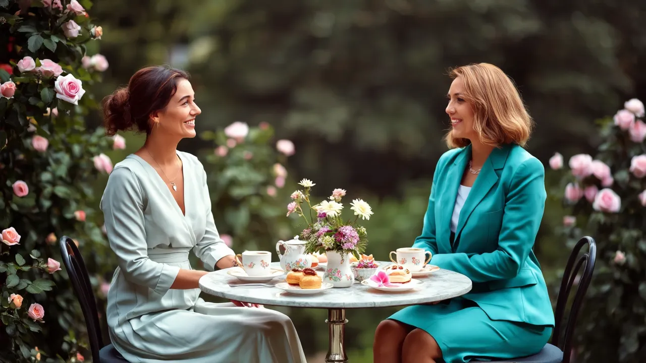 A serene outdoor scene depicts two women seated at a round table adorned with an elegant tea service and a variety of pastries. The background is filled with lush greenery and blooming roses, complemented by soft, diffused light that flows, creating an ethereal atmosphere. One woman is dressed in a light-colored dress and smiles at the other, who is also wearing a teal suit and appears content. Delicate flowers are placed on the table, enhancing the tranquil atmosphere.