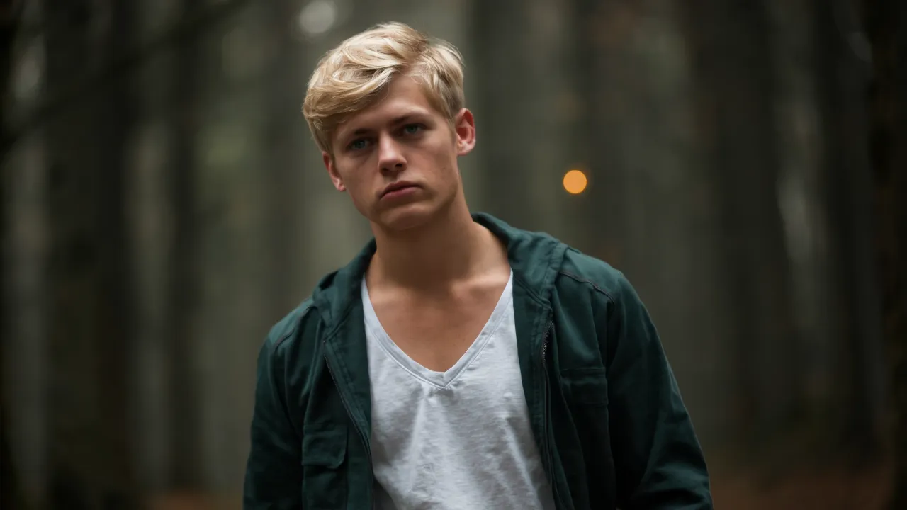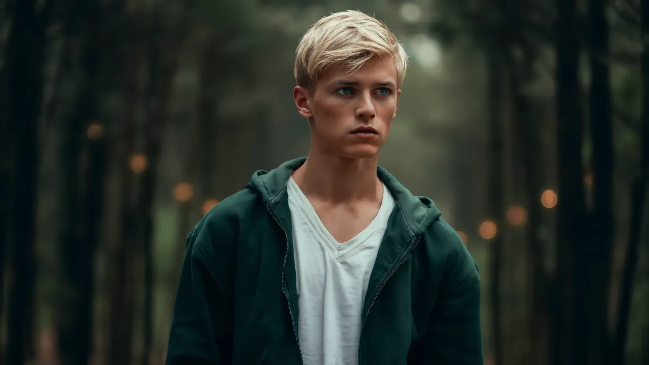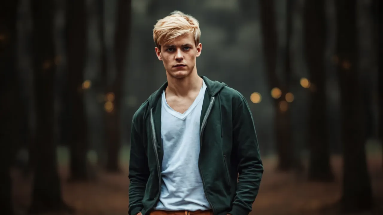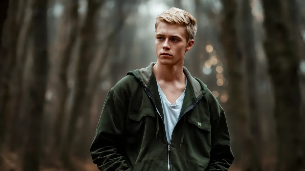 A young man with short blond hair stands in a forest setting, wearing a forest green zip-up jacket over a white V-neck shirt. He gazes pensively into the distance, displaying striking blue eyes. The background features blurred trees and soft, muted lighting, creating a serene yet introspective atmosphere. His brown pants have a relaxed fit, and subtle lights flicker in the air behind him, adding a magical touch to the scene.