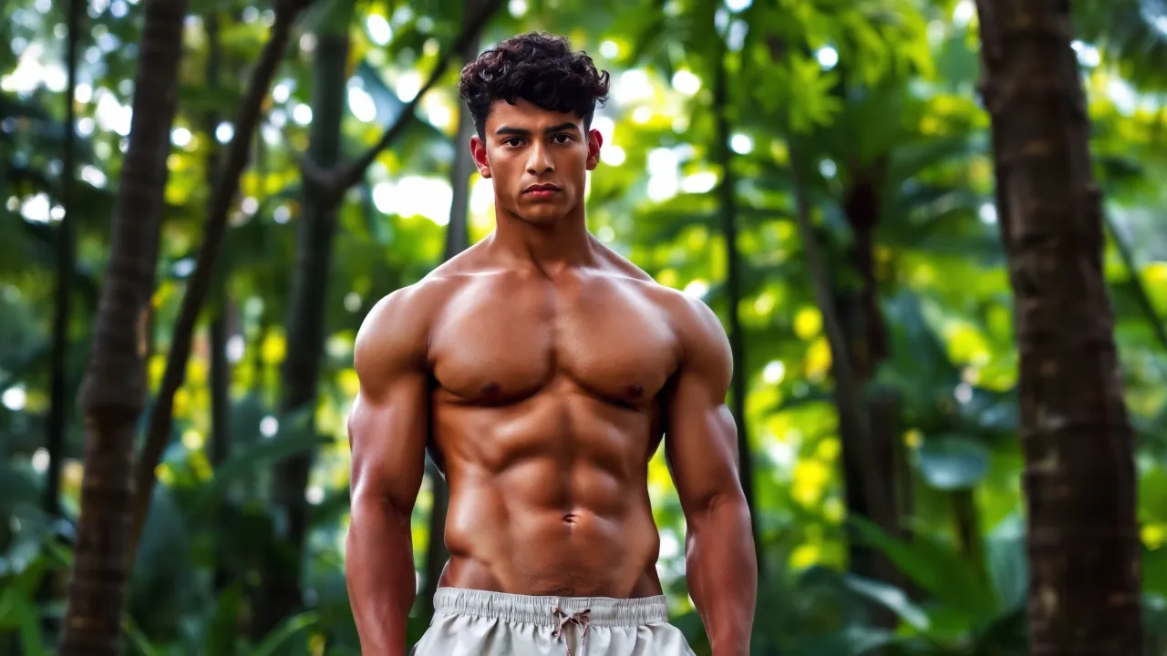 A muscular young man with a defined physique stands confidently in a lush, green forest. He has curly hair and a serious expression, wearing only light-colored shorts. The background features tall trees and vibrant foliage, creating a serene, tropical atmosphere. Soft light filters through the leaves, enhancing the natural beauty of the scene.