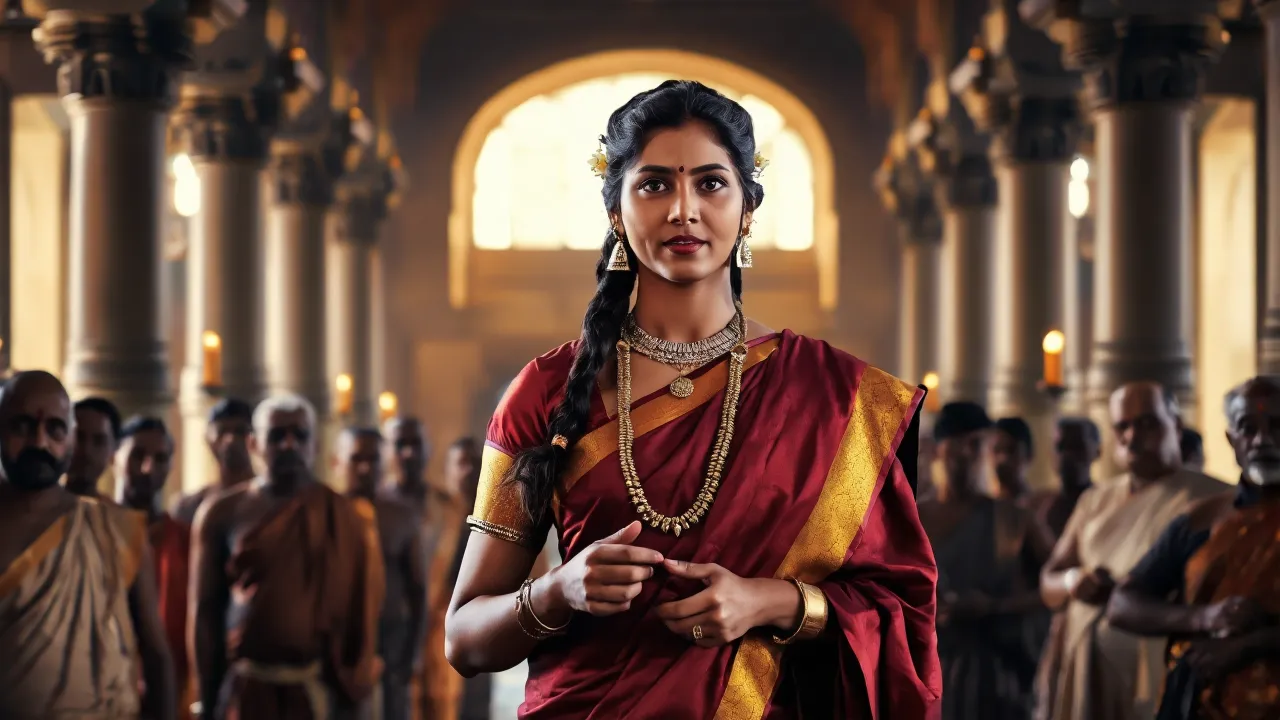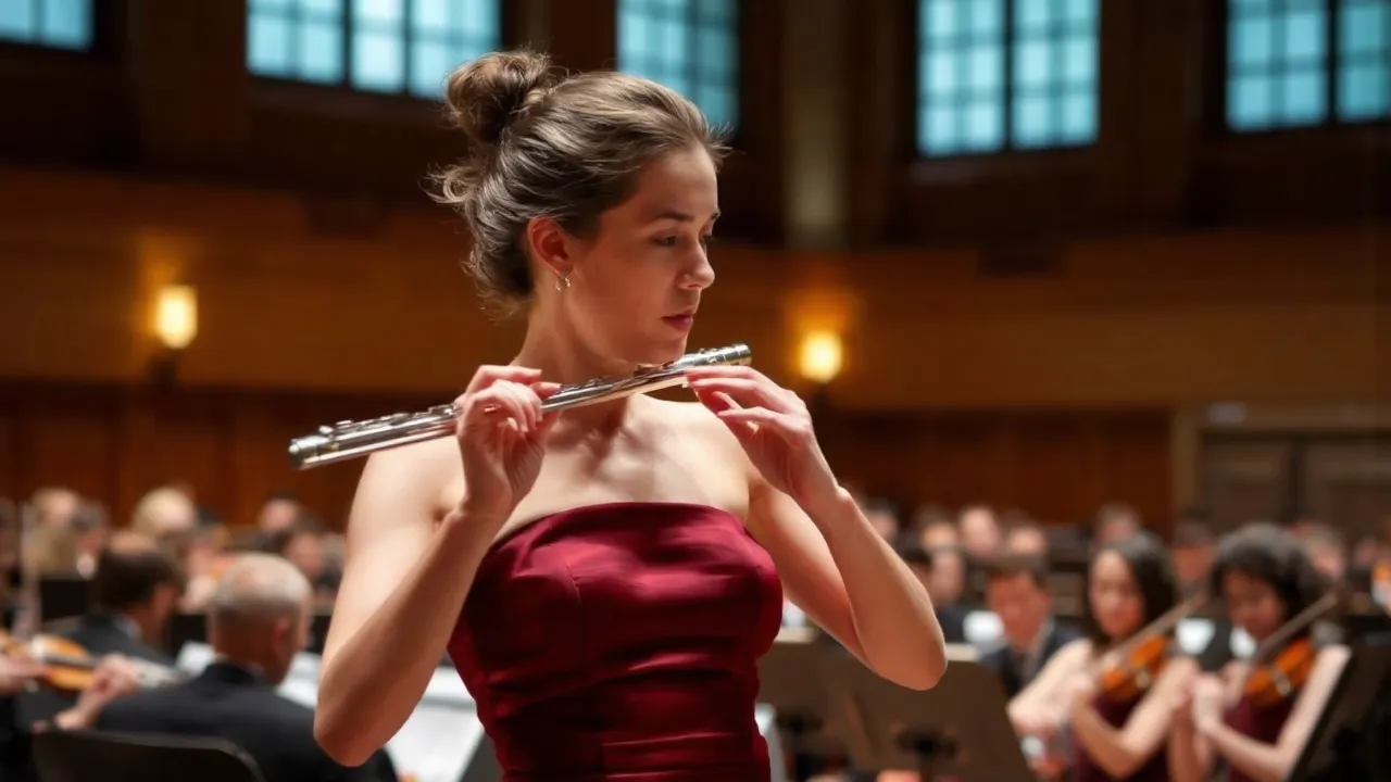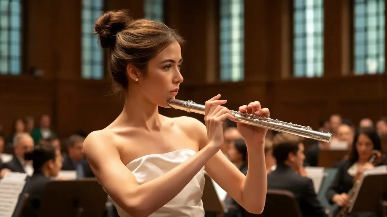A young woman in an elegant, strapless dress plays the flute with concentration and grace. Her hair is styled in a neat bun, and she wears delicate earrings. The stage is a concert hall with large windows, where an orchestra sits in the background, dedicated to her performance. The soft lighting highlights the woman’s concentration and the shining silver of her flute.