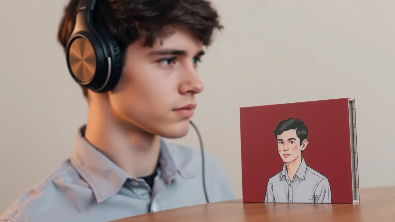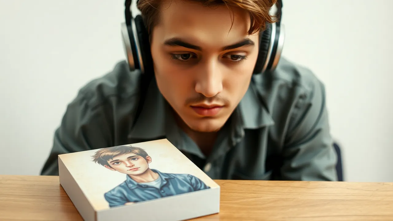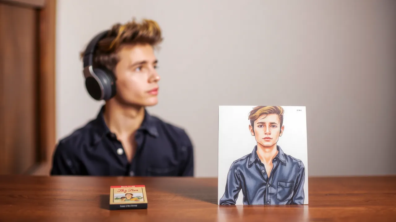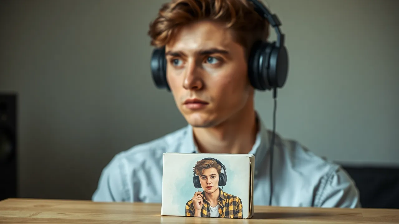 A young man wearing headphones has a contemplative expression and is dressed in a collared shirt. In the foreground, a small box or album cover with a similar illustration of the same young man is placed on a wooden surface, enhancing the artistic theme.