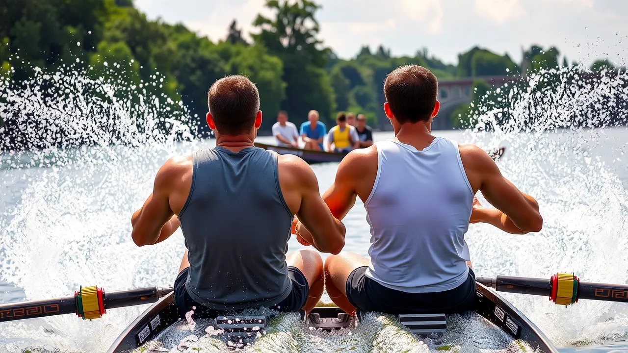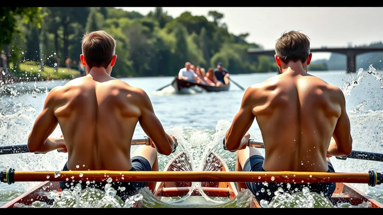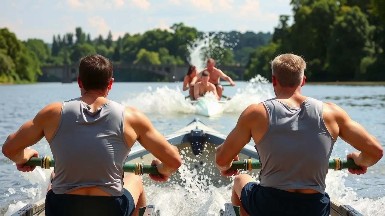 Two muscular rowers in a boat, rowing vigorously through the spray of water. They are seen from the front, wearing sleeveless shirts and shorts. In the background, several figures in another boat observe the scene. The landscape features trees and a bridge, suggesting a tranquil river setting.