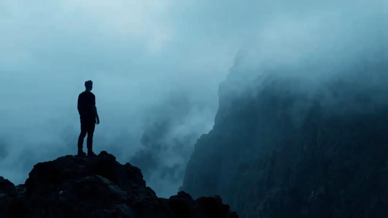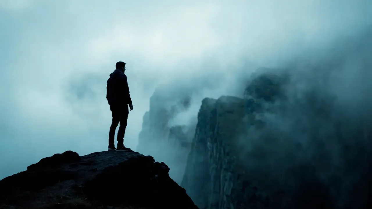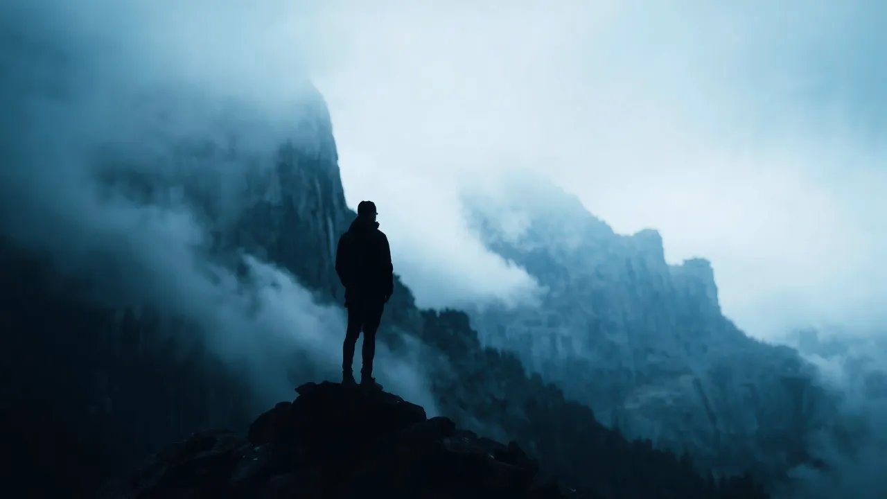 A silhouette of a person stands on a rocky outcrop, overlooking a spectacular landscape shrouded in mist. In the background, towering cliffs rise, partially obscured by low clouds. The overall atmosphere is melancholic and atmospheric, with a palette of cool blues and grays, evoking a sense of solitude and wonder in nature.