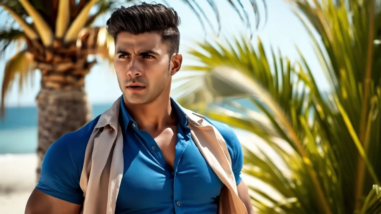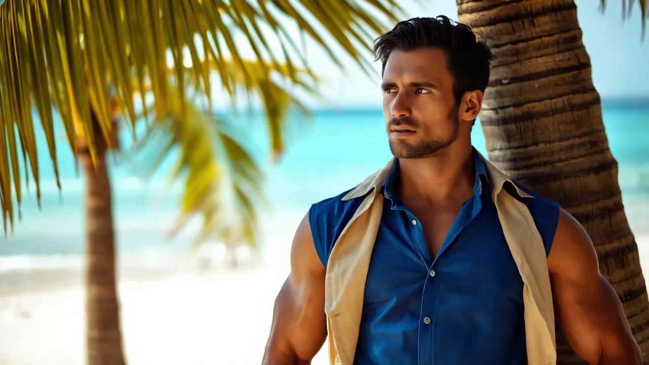 A muscular, dark-haired man stands next to a palm tree on a beach. He wears a fitted blue shirt with the top buttons undone and a beige jacket draped over his shoulders. The sunlit background features a sandy beach and clear blue water, suggesting a tropical setting. The man’s expression is contemplative, adding an elegant yet relaxed atmosphere to the scene.