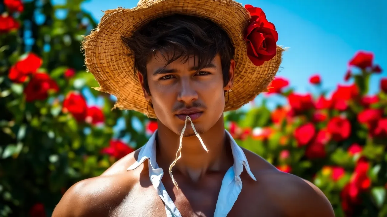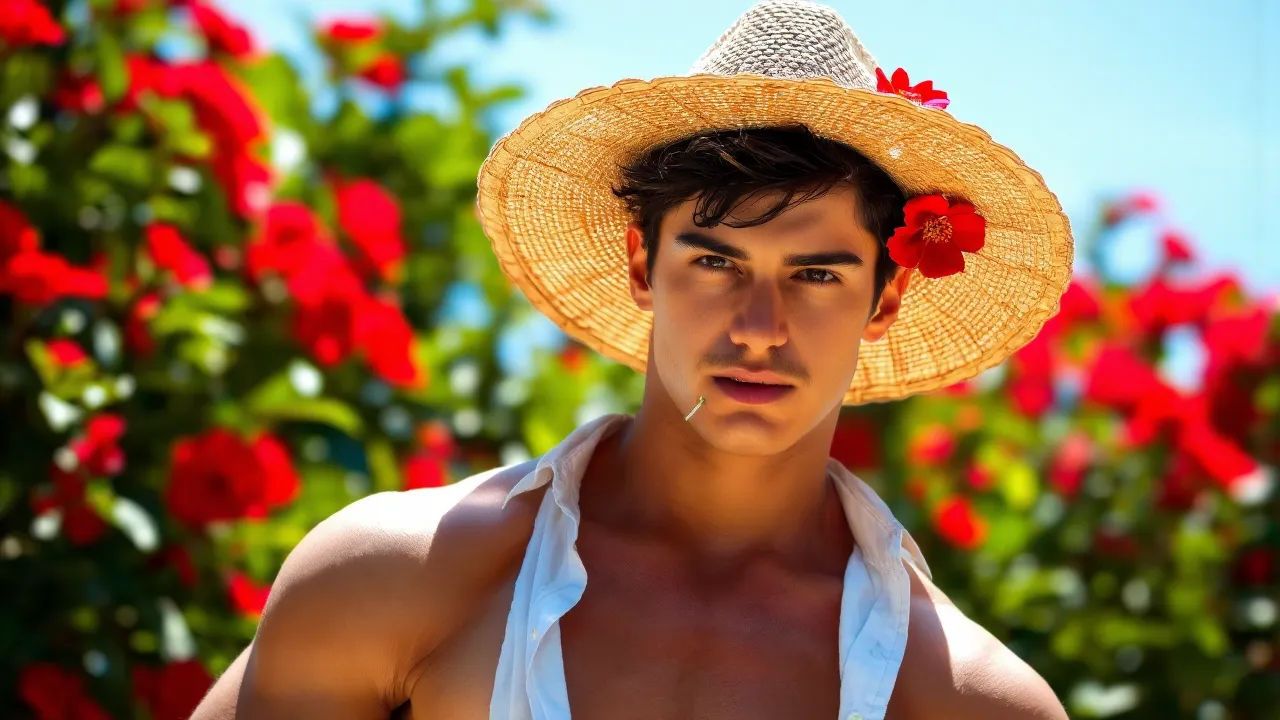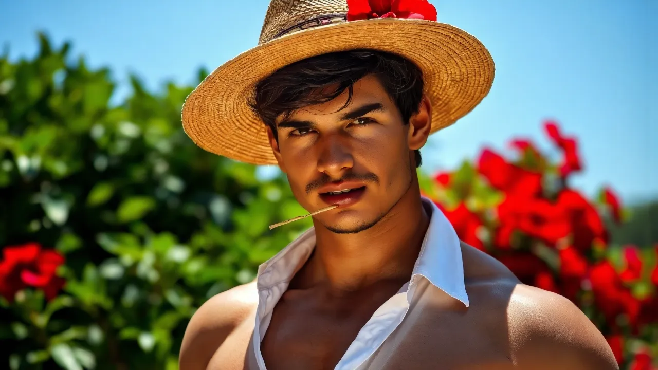 A muscular young man with a chiseled jaw and slightly tousled dark hair stands confidently in a sunlit garden. He wears a wide-brimmed straw hat adorned with a red flower and a partially unbuttoned white shirt. Beads of sweat glisten on his skin, highlighting his toned physique. In his mouth, he holds a piece of straw. The background features lush green foliage and vibrant red flowers against a bright blue sky.
