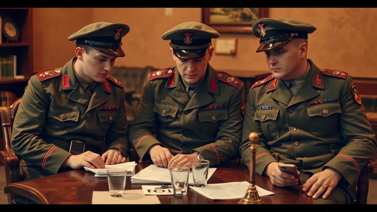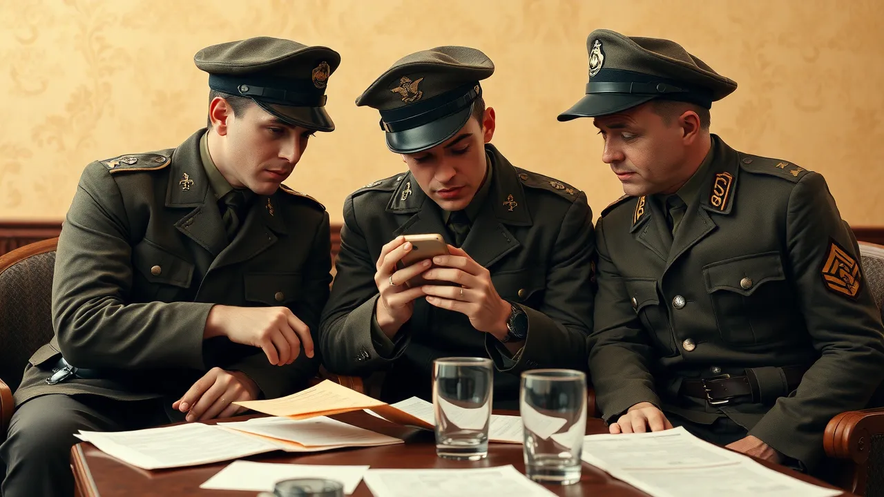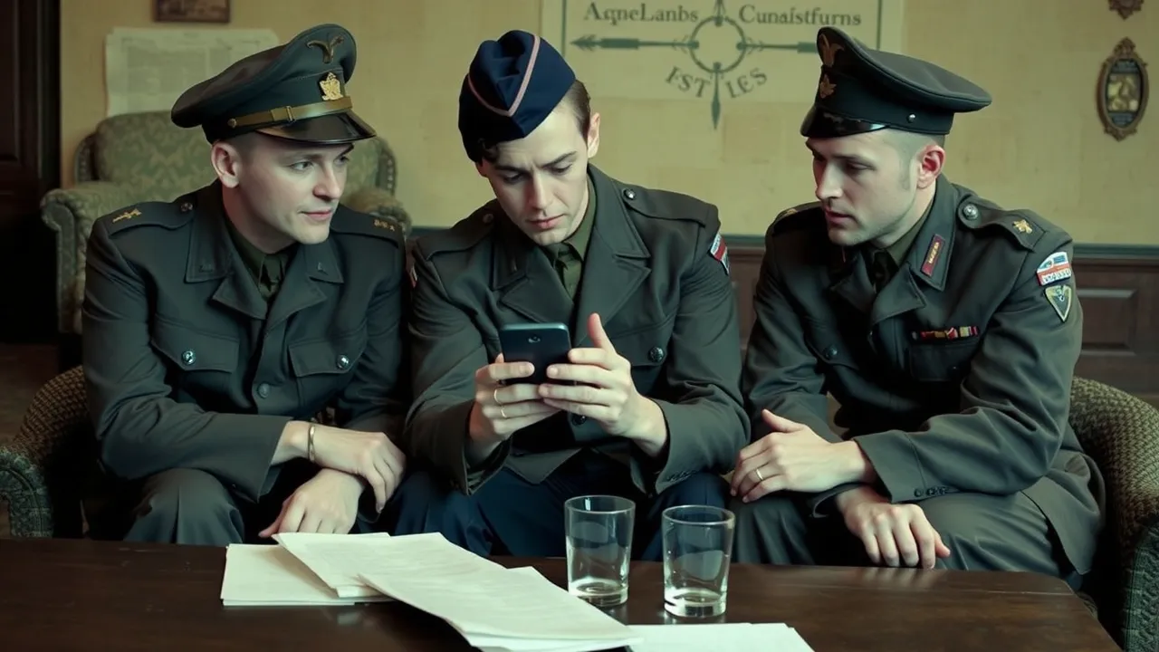Three soldiers in vintage military uniforms sit together, intensely focused on a smartphone one of them is holding. The setting has a warm color palette, enhancing the nostalgic atmosphere. Papers and a couple of glasses are scattered on a table in front of them, suggesting a moment of discussion or strategy amid a historically significant backdrop.