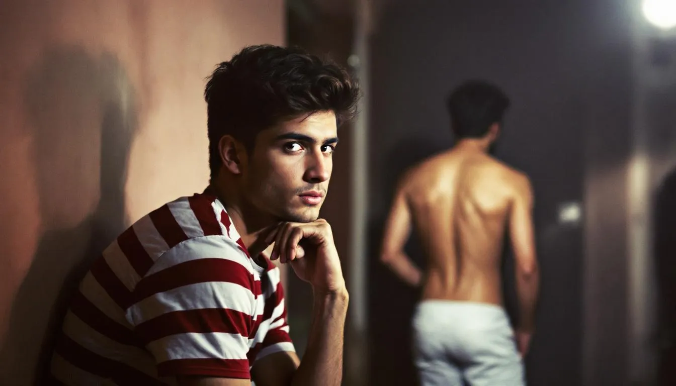 Photograph of two young men. The man in the foreground, dressed in a red and white striped T-shirt, leans casually against a wall with a contemplative expression. In contrast, the man in the background, seen from behind, shirtless in light-colored pants, stands with his back turned. The background is softly rendered with muted tones, creating an intimate atmosphere. Shadows and light interact throughout the scene, emphasizing the subjects’ relaxed poses.