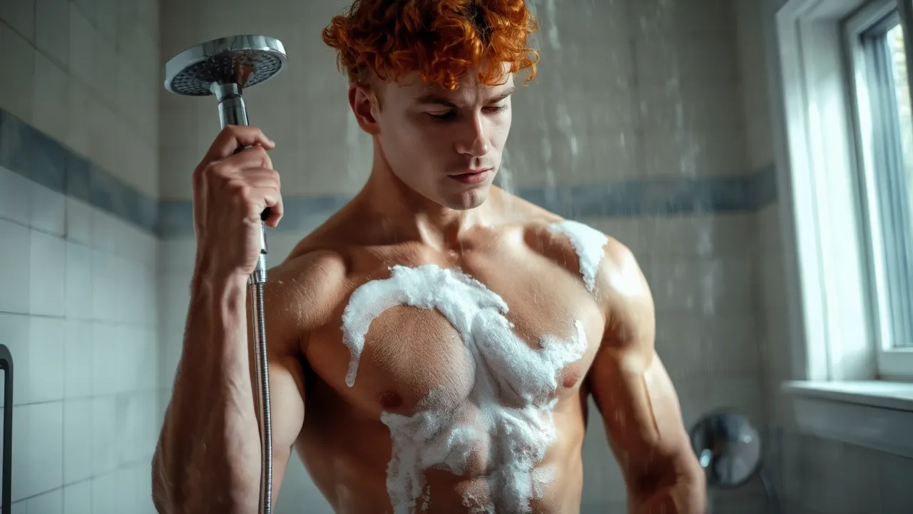 A muscular, young man with curly orange hair stands in a shower, holding a handheld showerhead. Water streams down his body, mixing with soap suds that cascade over his torso. The bathroom features light-colored tiles and a window allowing natural light to filter in, enhancing the steamy atmosphere. The focus is on the man’s defined physique and the play of water and soap.