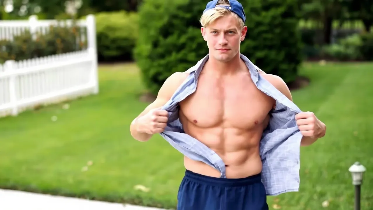 A muscular young man stands outdoors, opening a button-down shirt to reveal his bare chest. He has short blond hair and is wearing a blue cap. His blue eyes look slightly puzzled, and he appears to be blushing. He is wearing navy blue swim shorts. The background features a green lawn, bushes, and a white picket fence, suggesting a suburban setting.