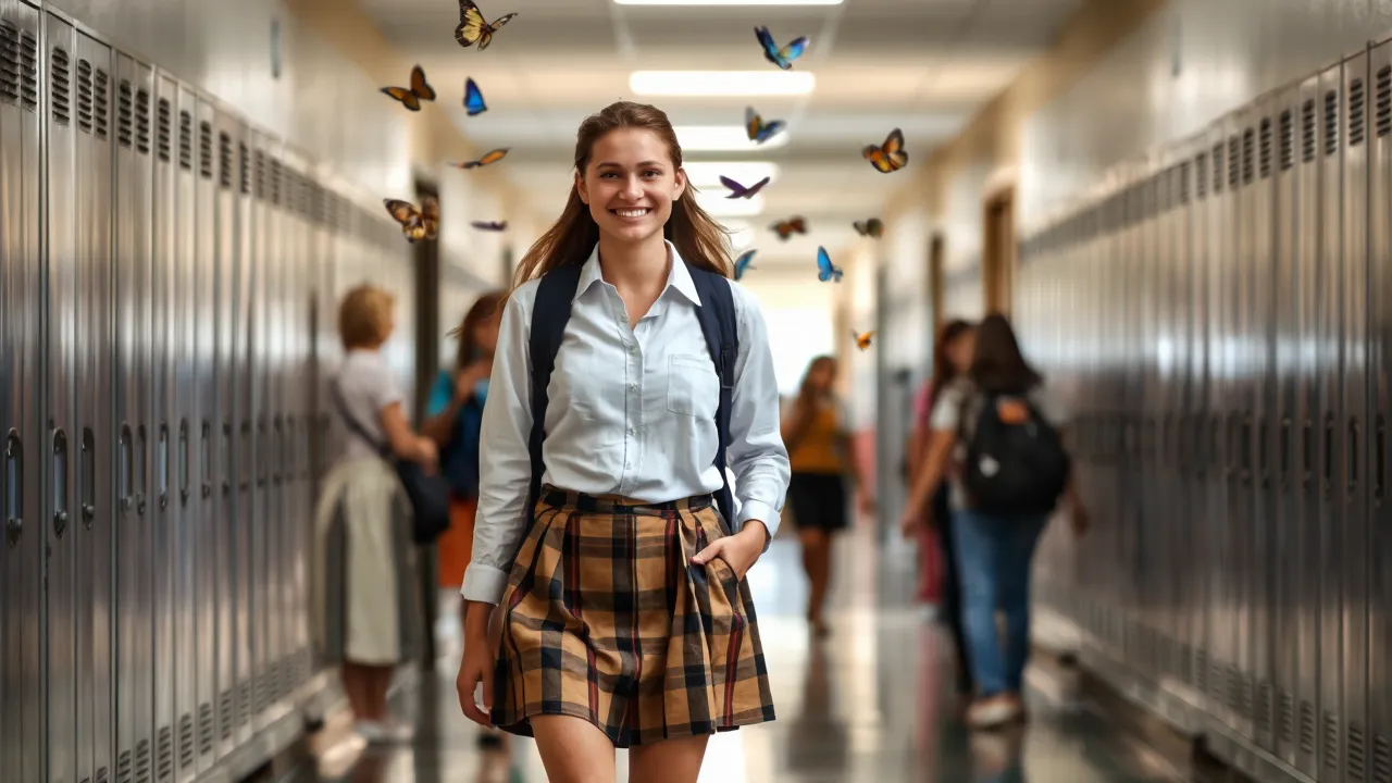 A young woman wearing a white shirt and plaid skirt walks confidently down a school hallway, surrounded by other students. She carries a backpack and stands out as butterflies float around her. The hallway is brightly lit, with paneled lockers and framed pictures along the walls. Other students appear engaged in their own activities, creating a lively atmosphere.