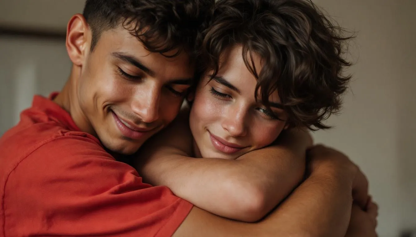 Una tierna fotografía de dos jóvenes abrazados, uno con camisa roja y el otro con el torso desnudo. Sus cuerpos están entrelazados, uno apoya su cabeza contra el hombro del otro. La obra de arte presenta una mezcla de tonos suaves y líneas atrevidas, creando una atmósfera emocional. El fondo muestra remolinos y colores abstractos, destacando la conexión íntima entre los dos hombres.