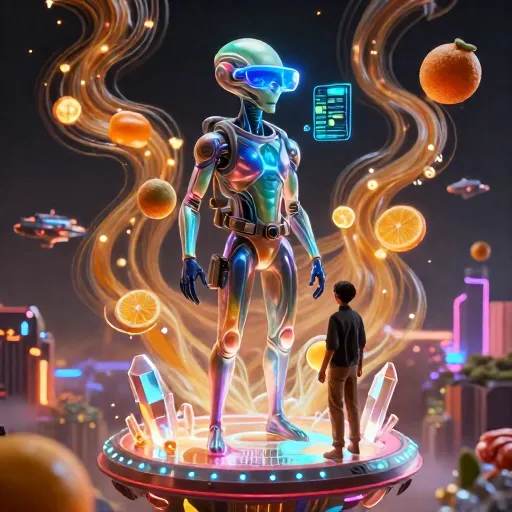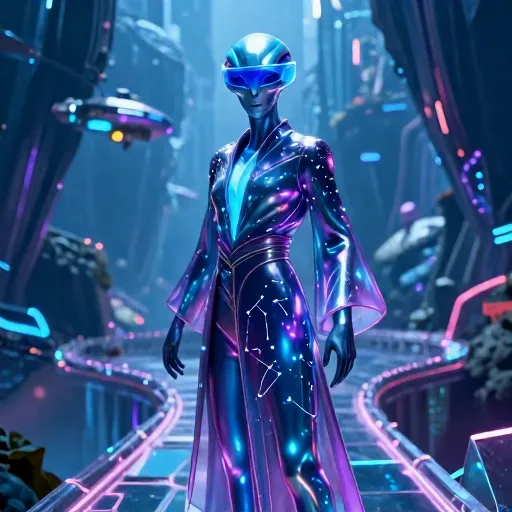 Imagine stepping onto a sleek intergalactic cruise and being greeted by your personal extraterrestrial tour guide – a being whose very presence feels like a blend of mystery and wonder. This guide, with iridescent skin that catches the light in ripples of blue and violet, wears a translucent sapphire visor that reflects distant nebulae and a flowing robe embroidered with glowing constellations that seem to map out the heavens. He stands on a crystal bridge that arches over a neon‑lit alien canyon, while floating sky‑ships drift lazily in the background, their hulls echoing the same star‑kissed patterns. The scene is rendered in a hyper‑detailed retro‑futurist illustration, complete with cinematic lighting and a high‑resolution polish that makes every luminous detail pop.