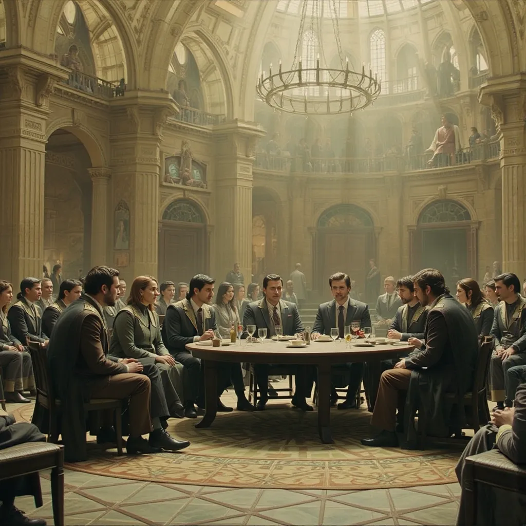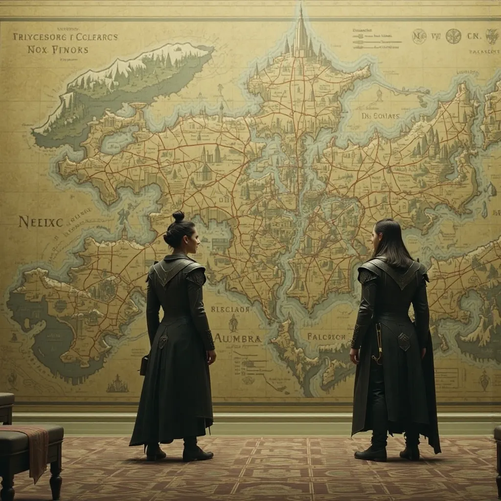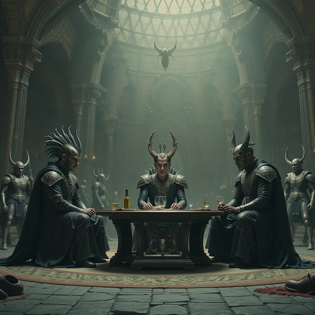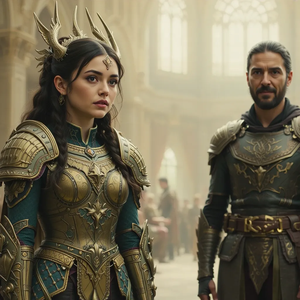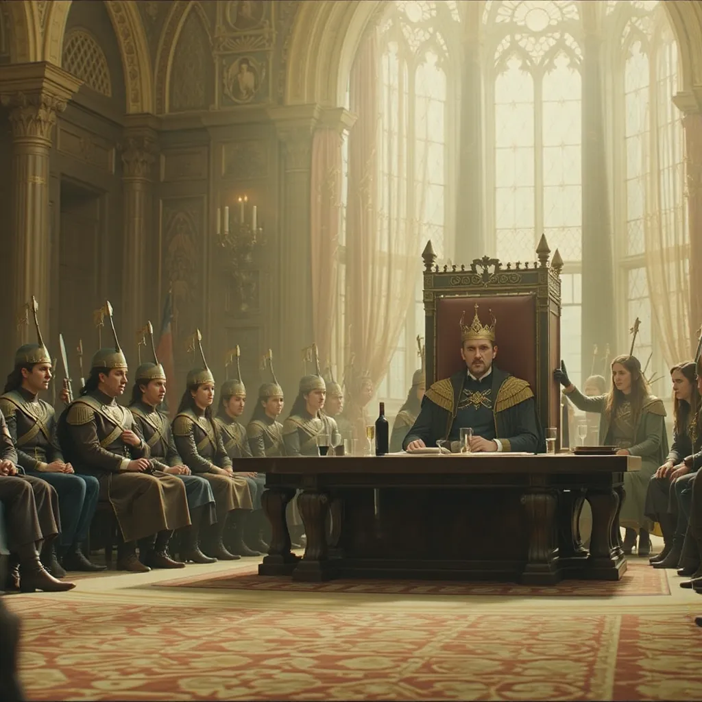 Horas más tarde, en el Gran Salón del Palacio de Auretia, los líderes se reunieron. En la mesa central estaba el Rey Aldric Targarien, flamante y venerable, con su manto de fuego dorado. A su lado, los representantes de la casa Glave y otros nobles de alto rango. Al frente, en el asiento que inspiraba recelo y desconfianza, se encontraba Emperador Kaelith Von Nilvan, un hombre de acero y ambición, su atuendo reflejando la maquinaria avanzada que caracterizaba su imperio.
