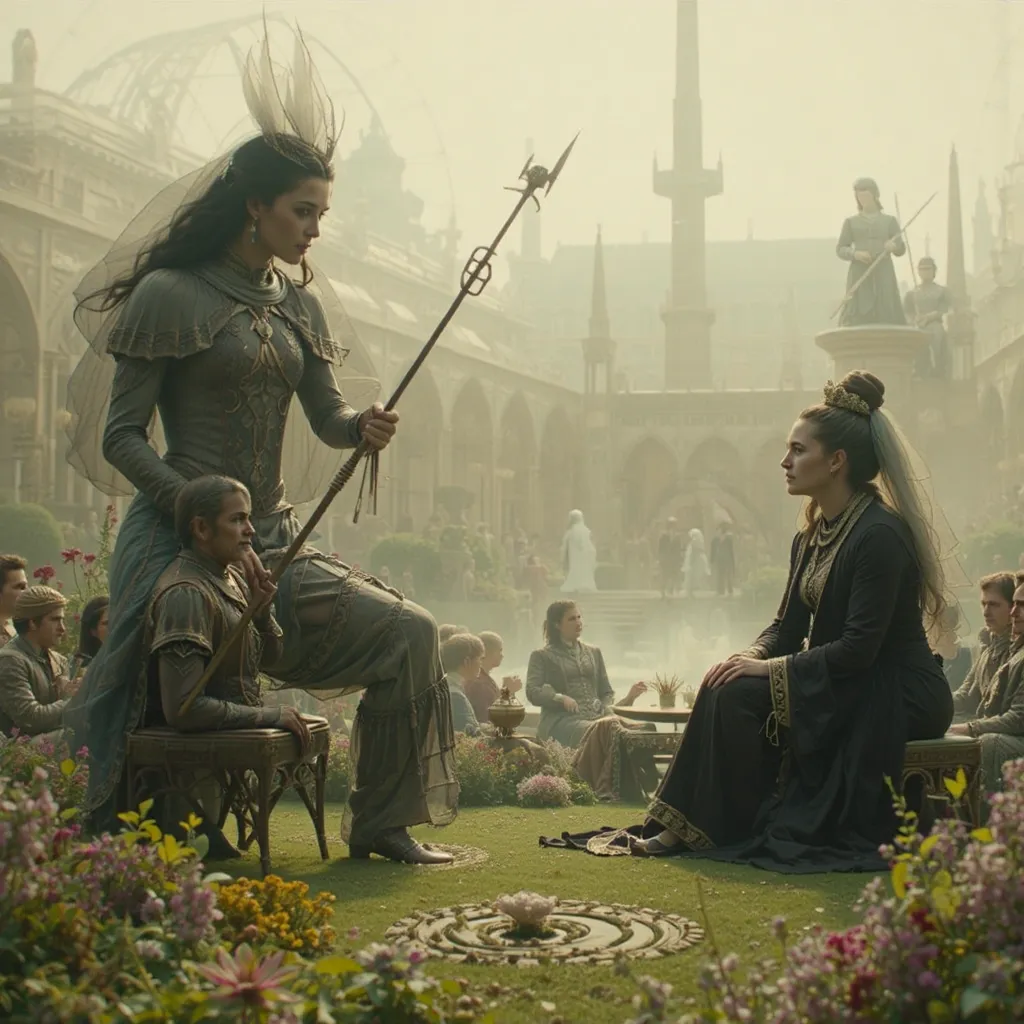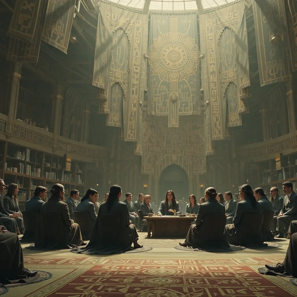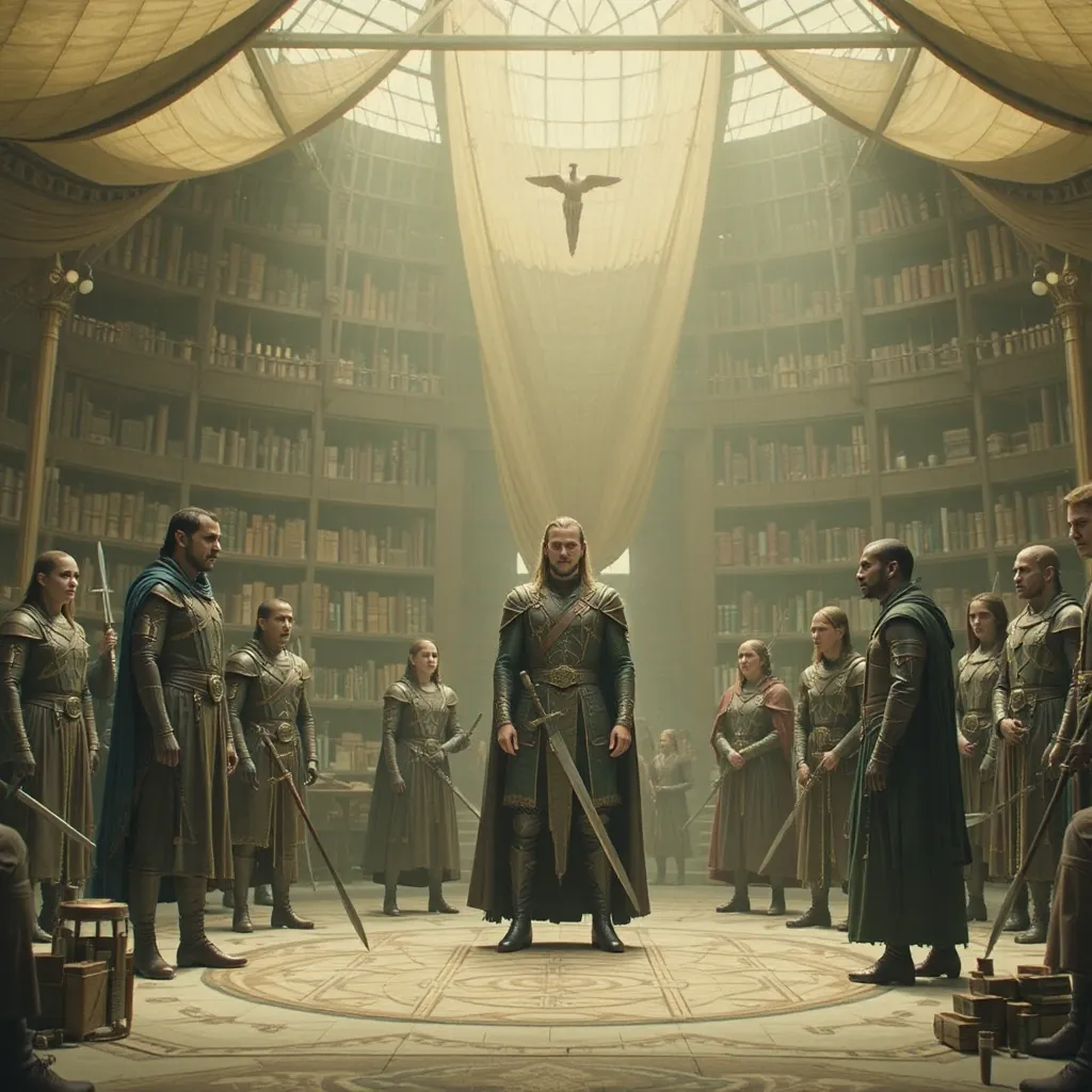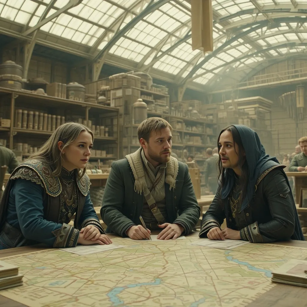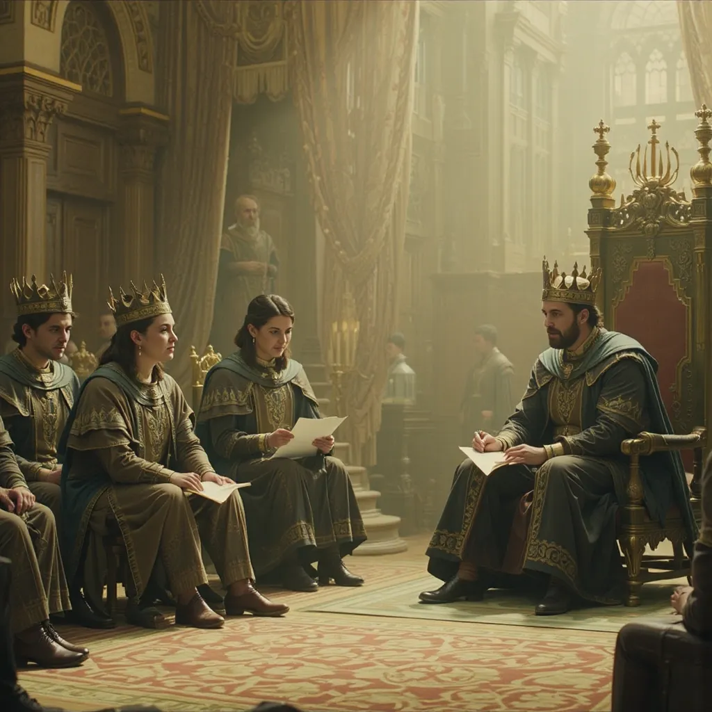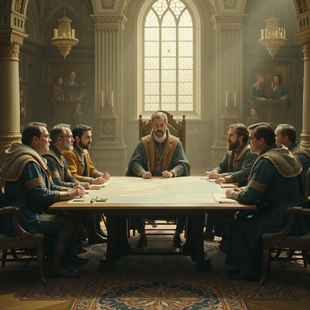 Horas más tarde, en el Gran Salón del Palacio de Auretia, los líderes se reunieron. En la mesa central estaba el Rey Aldric Targarien, flamante y venerable, con su manto de fuego dorado. A su lado, los representantes de la casa Glave y otros nobles de alto rango. Al frente, en el asiento que inspiraba recelo y desconfianza, se encontraba Emperador Kaelith Von Nilvan, un hombre de acero y ambición, su atuendo reflejando la maquinaria avanzada que caracterizaba su imperio.