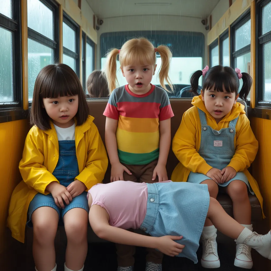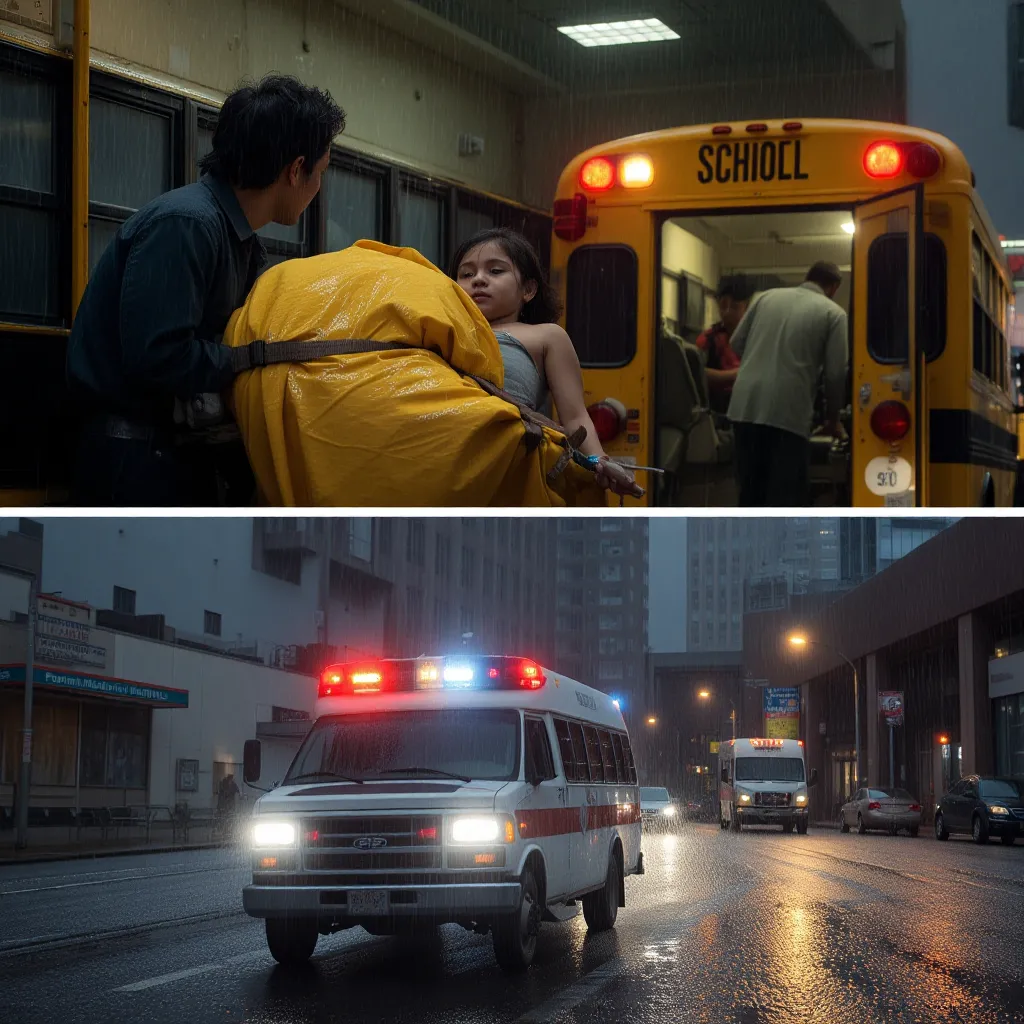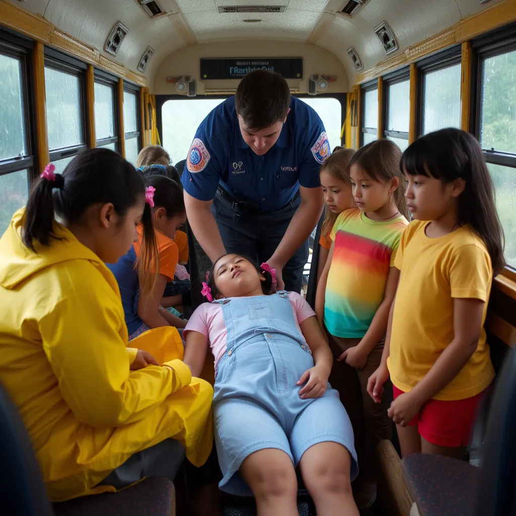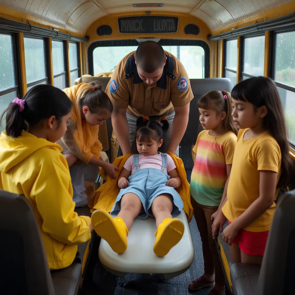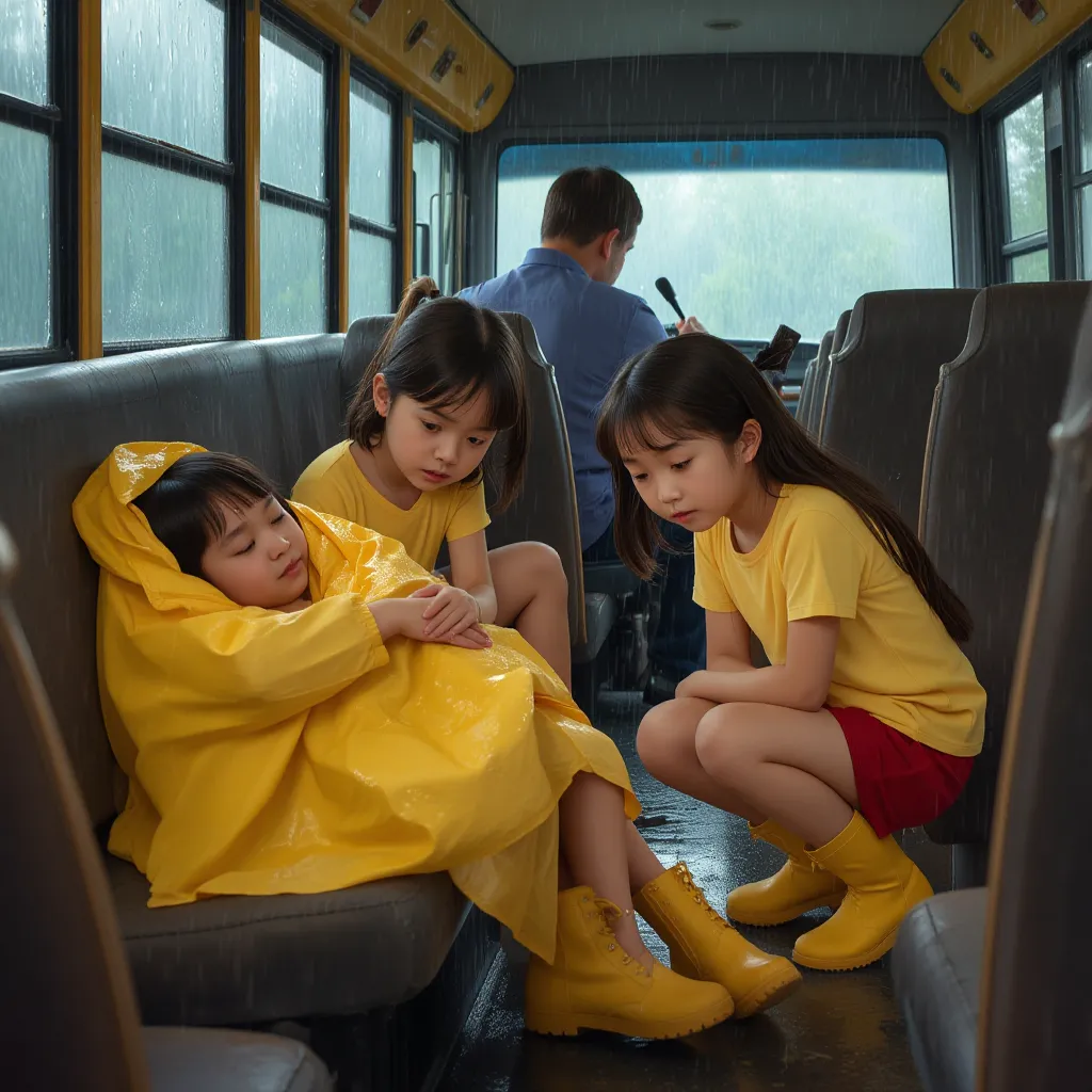 The bus driver quickly realizes Isabella isn’t breathing and immediately reaches for the radio to call emergency services. Meanwhile, Isabella’s best friend Sofia, an 8-year-old Latina girl wearing a plain yellow t-shirt with red shorts and yellow boots, acts quickly and compassionately. Without hesitation, Sofia removes her yellow raincoat and gently drapes it over Isabella to keep her warm, using it as a blanket. The other girls watch anxiously, hoping for help to arrive soon as the rain softly taps the bus windows, amplifying the tension inside the vehicle.