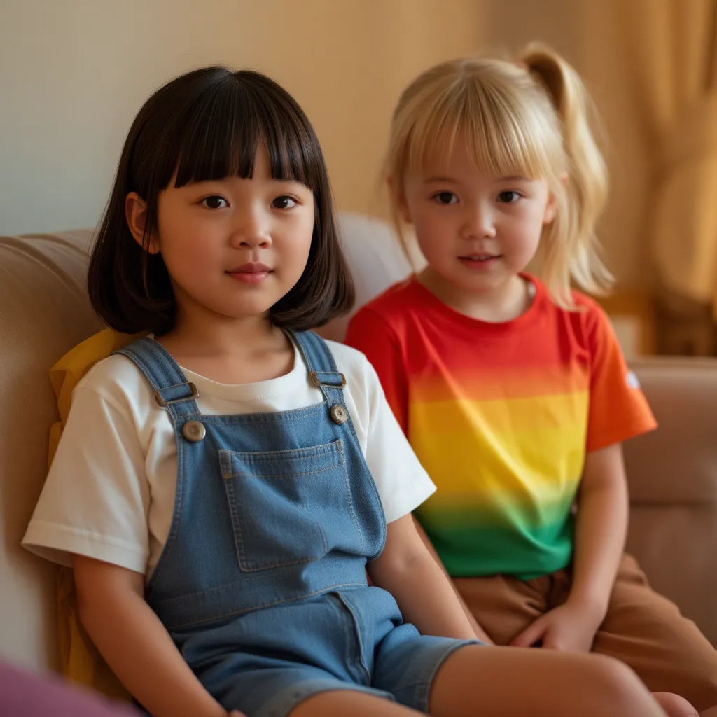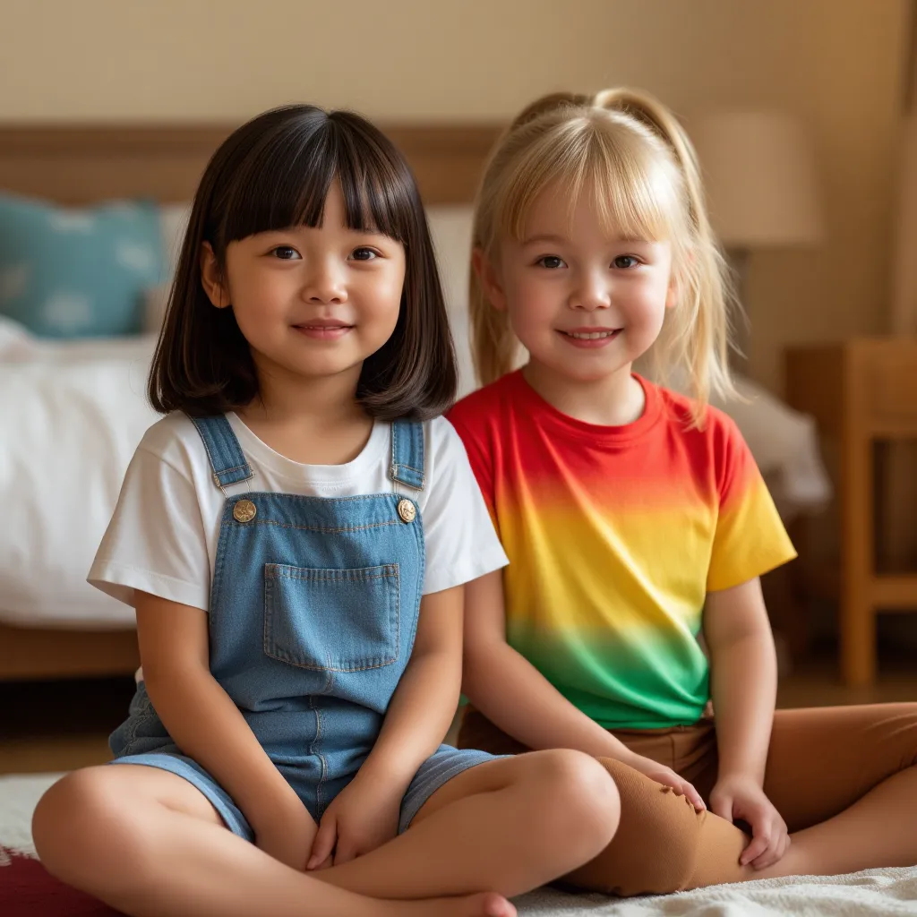Daisy and Mei are sitting next to each other on the cozy bedroom floor. Mei, the 7-year-old Asian girl with straight brunette hair, wears her blue shorts overalls layered over a plain white t-shirt. Daisy, the 6-year-old blonde girl with a ponytail and bangs, is dressed in her bright t-shirt fading from red to yellow to green, paired with brown pants. They sit close, sharing a quiet moment together with soft, warm lighting surrounding them, creating a comforting and hopeful atmosphere.