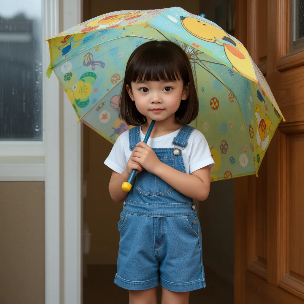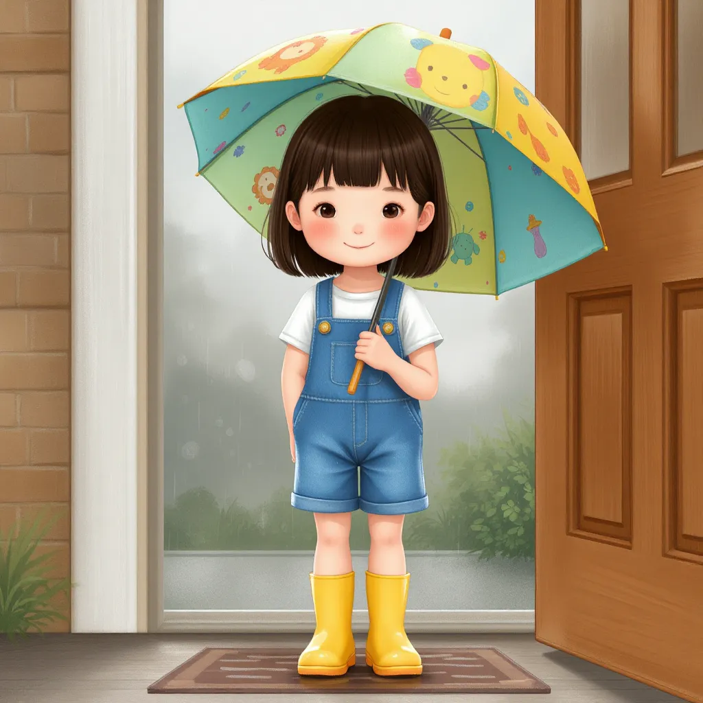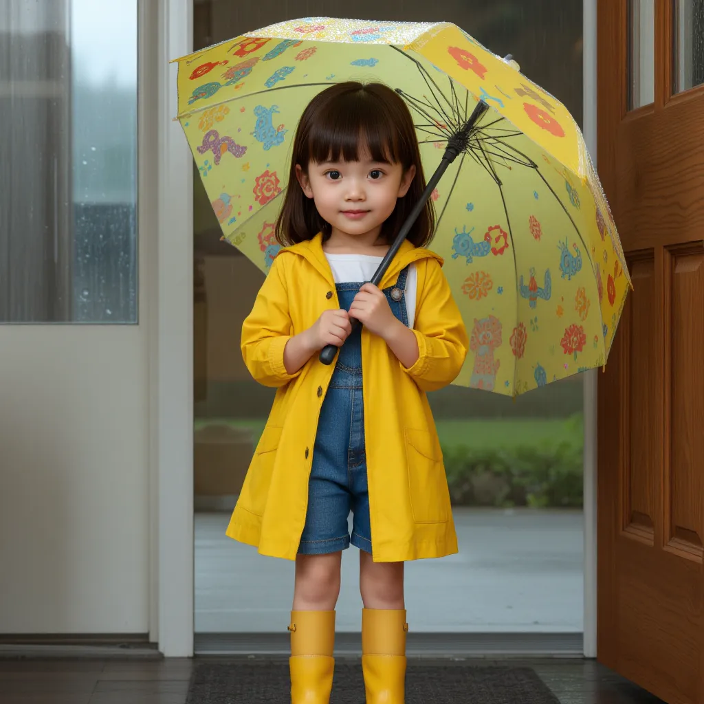 Mei, the 7-year-old Asian girl with straight brunette hair, finishes putting on her yellow raincoat over her blue shorts overalls and plain white t-shirt. She secures the raincoat’s buttons and pulls up the hood to keep herself dry. Ready and protected from the rain, she grabs her colorful umbrella with cartoon animals and steps toward the door. Outside, the rain continues to fall gently, but Mei is prepared and eager to head out to school.