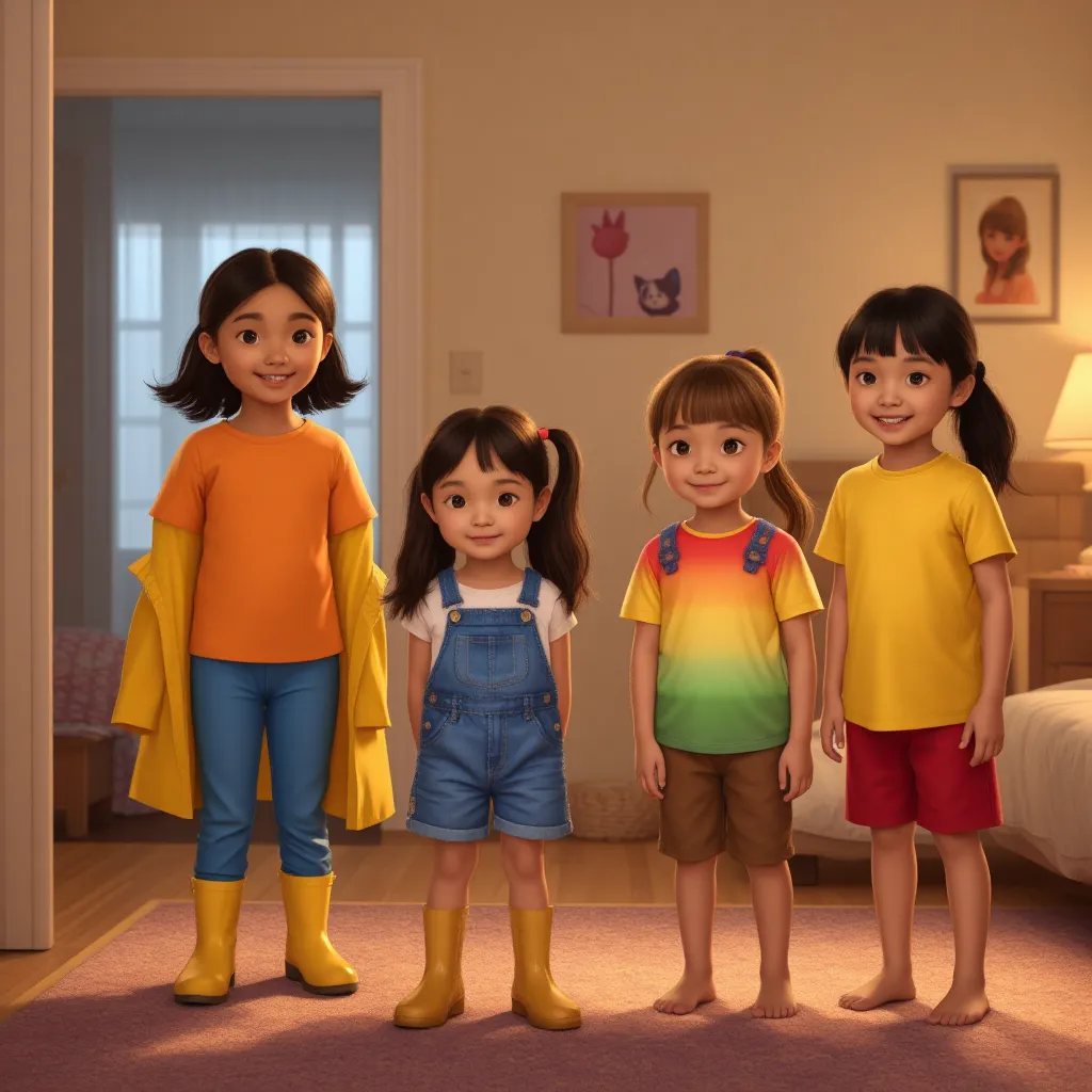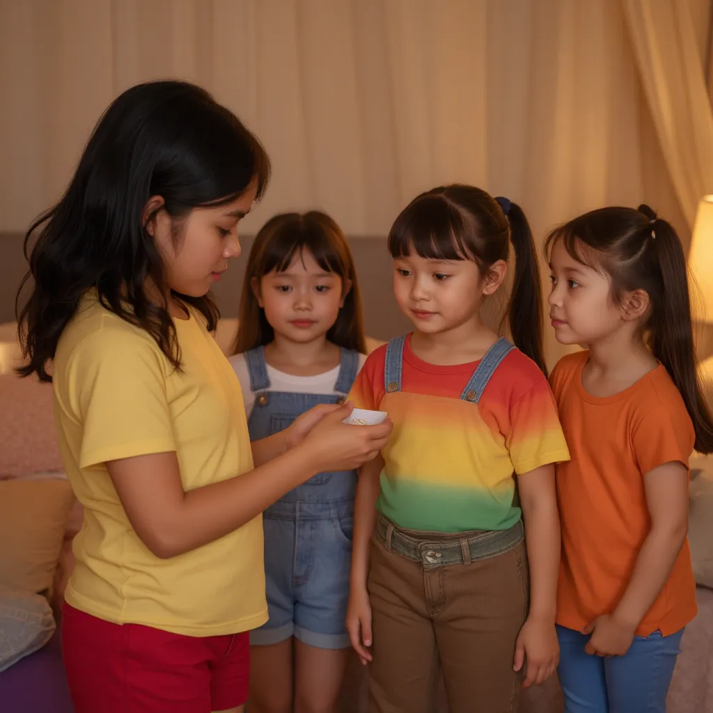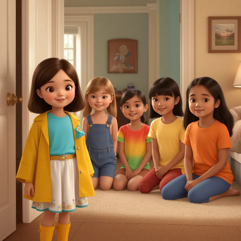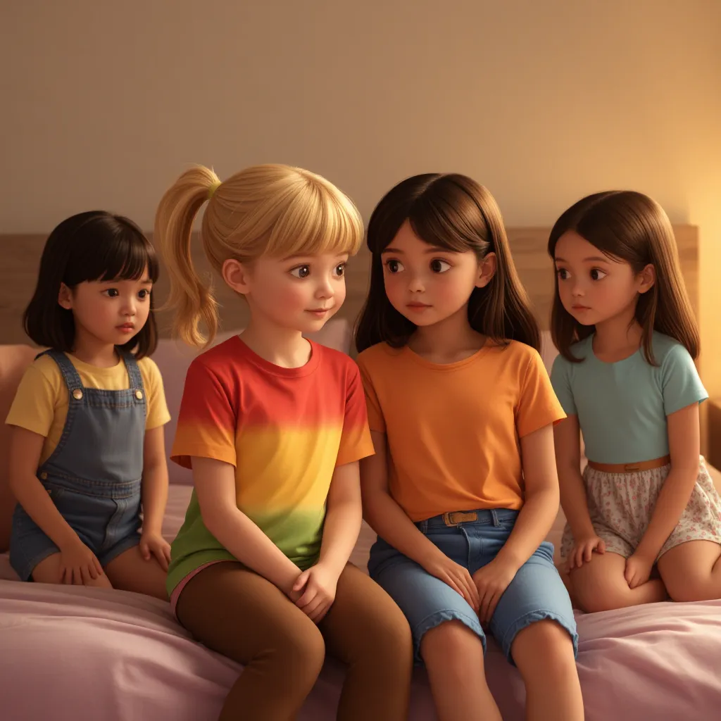 Later that night, the girls gathered again for another sleepover at Sofia’s cozy home. This time, they all chose to wear their day clothes to sleep—Mei in her blue shorts overalls layered over a plain white t-shirt, Daisy in her bright t-shirt fading from red to yellow to green with brown pants, Sofia in her plain yellow t-shirt and red shorts, Maria in her plain orange t-shirt and blue pants, and Lily in her aqua blue t-shirt with a gold belt paired with a white floral skirt. Despite the sadness they shared, the girls found comfort in each other’s company, wrapped in friendship and hope as they stayed close through the night.