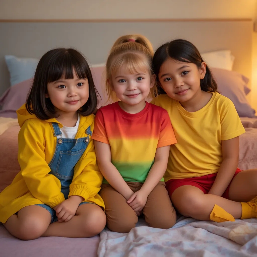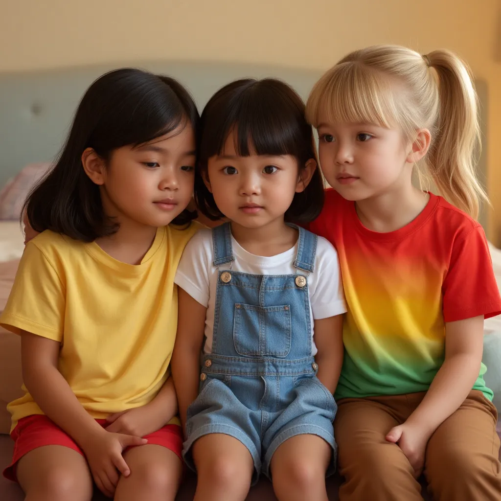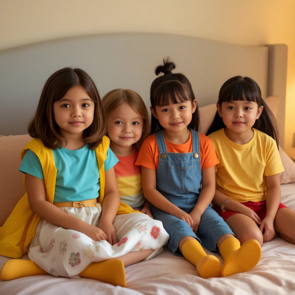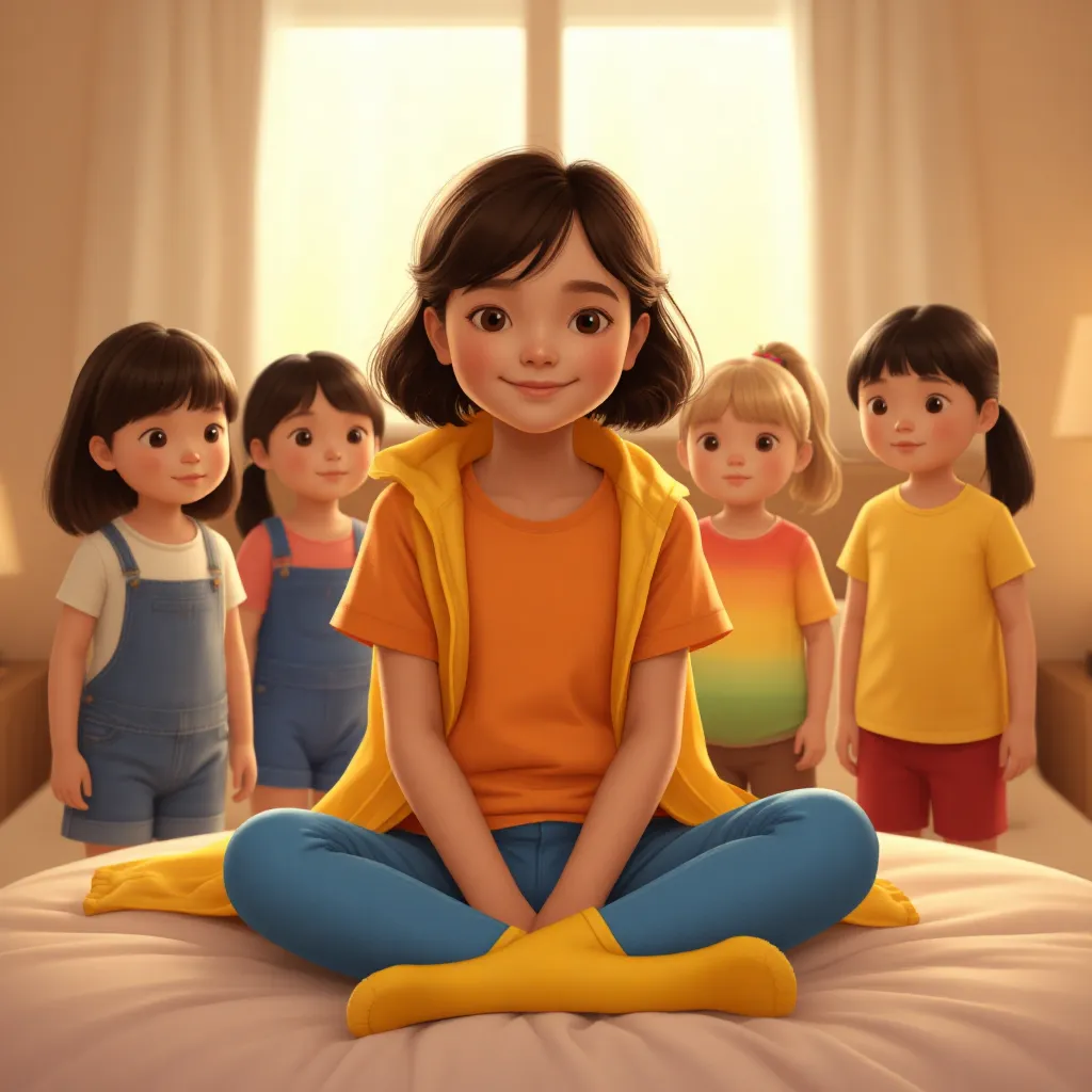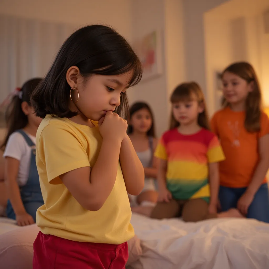 Later that night, the girls gathered again for another sleepover at Sofia’s cozy home. This time, they all chose to wear their day clothes to sleep—Mei in her blue shorts overalls layered over a plain white t-shirt, Daisy in her bright t-shirt fading from red to yellow to green with brown pants, Sofia in her plain yellow t-shirt and red shorts, Maria in her plain orange t-shirt and blue pants, and Lily in her aqua blue t-shirt with a gold belt paired with a white floral skirt. Despite the sadness they shared, the girls found comfort in each other’s company, wrapped in friendship and hope as they stayed close through the night.