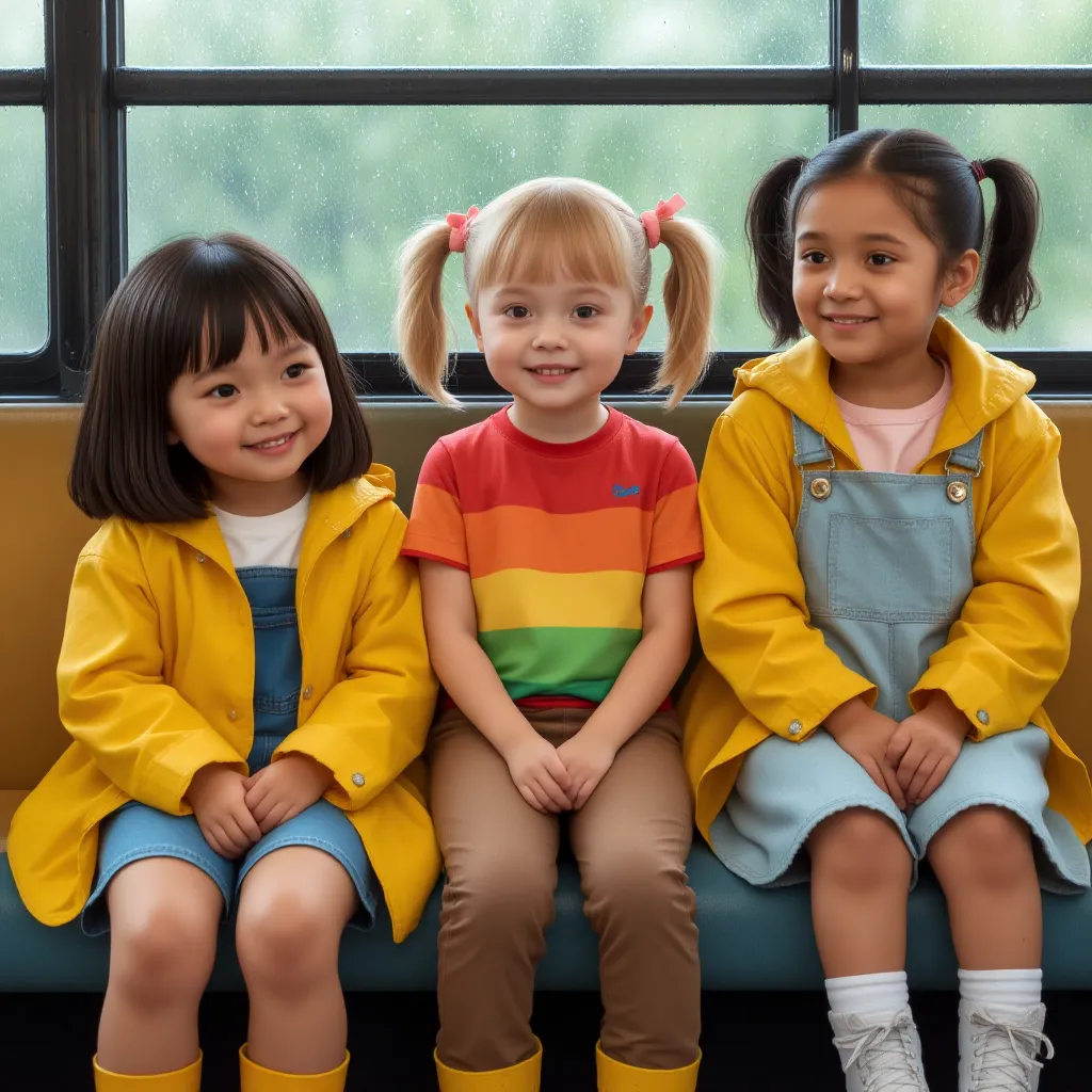 As Mei and Daisy sang happily on the bus, their best friend Isabella soon joined them. Isabella is a 9-year-old Latina girl with ponytails tied with pink ribbon bows and bangs framing her face. She wore light blue skirt overalls over a light pink t-shirt, paired with white sneakers and white socks. Small gold hoop earrings added a touch of sparkle, and like her friends, she wore a bright yellow raincoat and matching yellow rain boots to stay dry in the rain. The three girls, best friends for over a year, shared warm smiles and laughter as they settled together on the bus, their bond shining bright despite the gray rainy morning outside.