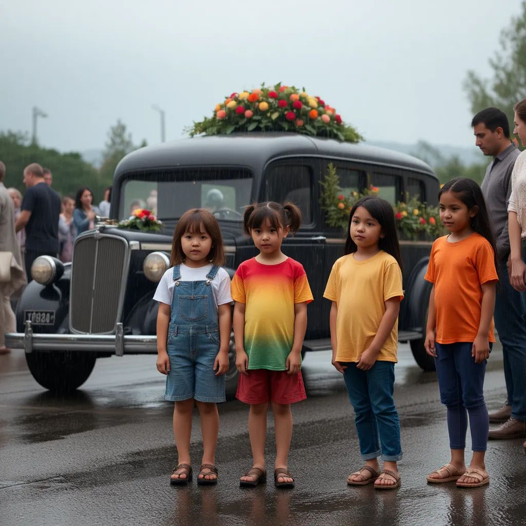 At the funeral, the friends and families gathered to say their final goodbyes to Isabella. In a heartfelt tribute, they brought the 1939 Ford 3-seater bus—the very same Plaza Sésamo bus that had been part of so many of their joyful memories, including the time when they turned into cartoon versions of themselves over the summer. The bus had been transformed into a hearse, carrying Isabella’s casket with dignity and love. It symbolized the deep connection they shared and the lasting impact Isabella had on all their lives. The somber procession moved slowly, rain softly falling, as everyone honored her memory and the precious moments they had together.