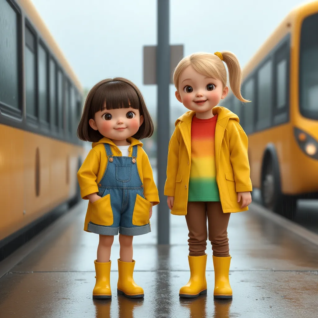 Mei, now wearing her yellow raincoat over her blue shorts overalls and plain white t-shirt, with bright yellow rain boots on, walks carefully to the bus stop. The rain softly falls around her as she approaches and spots her best friend, Daisy—a 6-year-old blonde girl with a ponytail and bangs. Daisy is dressed in a bright, colorful t-shirt that fades from red to yellow to green, paired with brown pants, and she’s also wearing a yellow raincoat and matching rain boots. The two girls smile and wave excitedly to each other, their umbrellas close by since their raincoats keep them dry. They chat happily as they wait for the bus, ready for another day of fun and learning at school.