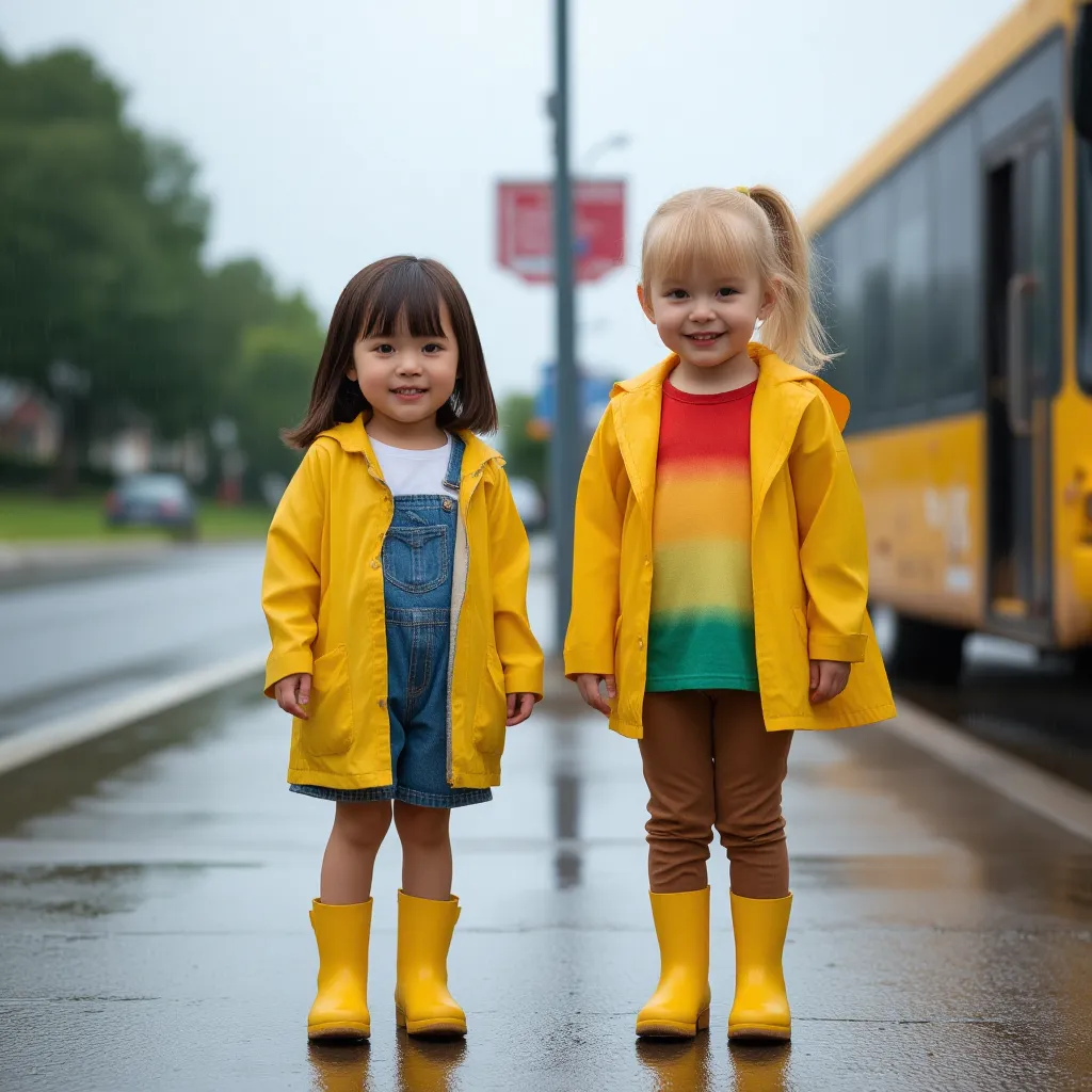 Mei, the 7-year-old Asian girl with straight brunette hair, wearing her yellow raincoat over blue shorts overalls and a plain white t-shirt, bright yellow rain boots, meets her best friend Daisy at the bus stop. Daisy is a 6-year-old blonde girl with a ponytail and bangs, dressed in a bright, colorful t-shirt fading from red to yellow to green, brown pants, a yellow raincoat, and matching yellow rain boots. Both girls are smiling excitedly under gray rainy skies, standing on the wet pavement with raindrops falling softly around them. Their joyful expressions capture the warmth of friendship despite the rainy weather.