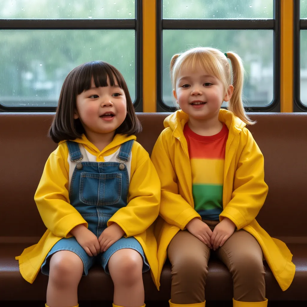 As the rain continued to fall softly, Mei and Daisy climbed onto the bus together, still smiling and full of energy. Sitting side by side, the two friends began to sing their favorite songs, their voices blending happily over the quiet hum of the bus engine. Their yellow raincoats were draped over the seats, and their bright rain boots rested on the wet floor mats. Outside the window, drops slid down the glass, but inside the bus, the warmth of friendship and joyful singing made the rainy morning feel sunny.