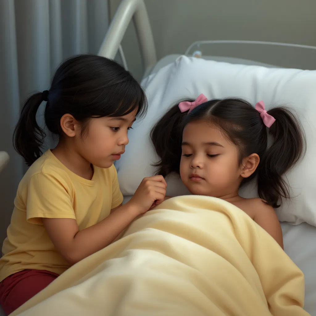 Later, Mei and Daisy arrive at the ICU room. They quietly take off their bright yellow raincoats, folding them carefully before sitting down together in a chair beside Sofia. The three friends hold hands, sharing a moment of silent support and hope for Isabella’s recovery. The soft hum of the machines fills the calm room as the girls stay close, their presence a comforting reminder of their strong bond and love for their best friend.
