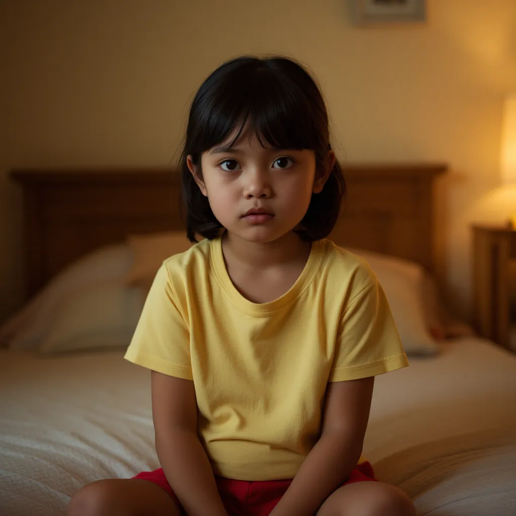 Sofia, the 8-year-old Latina girl with dark hair, sits alone in a cozy, softly lit bedroom. She wears her plain yellow t-shirt and red shorts, her expression thoughtful and a little sad as she looks down, holding her hands gently in her lap. The quiet room around her reflects a calm yet somber mood, capturing a moment of reflection and hope amid difficult times.