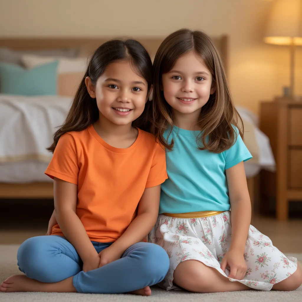 Maria and Lily are sitting together on the cozy bedroom floor. Maria, an 8-year-old brunette girl wearing a plain orange t-shirt and blue pants, sits comfortably next to Lily, an 8-year-old girl with shoulder-length brunette hair dressed in an aqua blue t-shirt with a gold belt and a white skirt decorated with floral patterns. Both girls are relaxed and smiling softly as warm, soft lighting fills the room, creating a comforting and hopeful atmosphere.