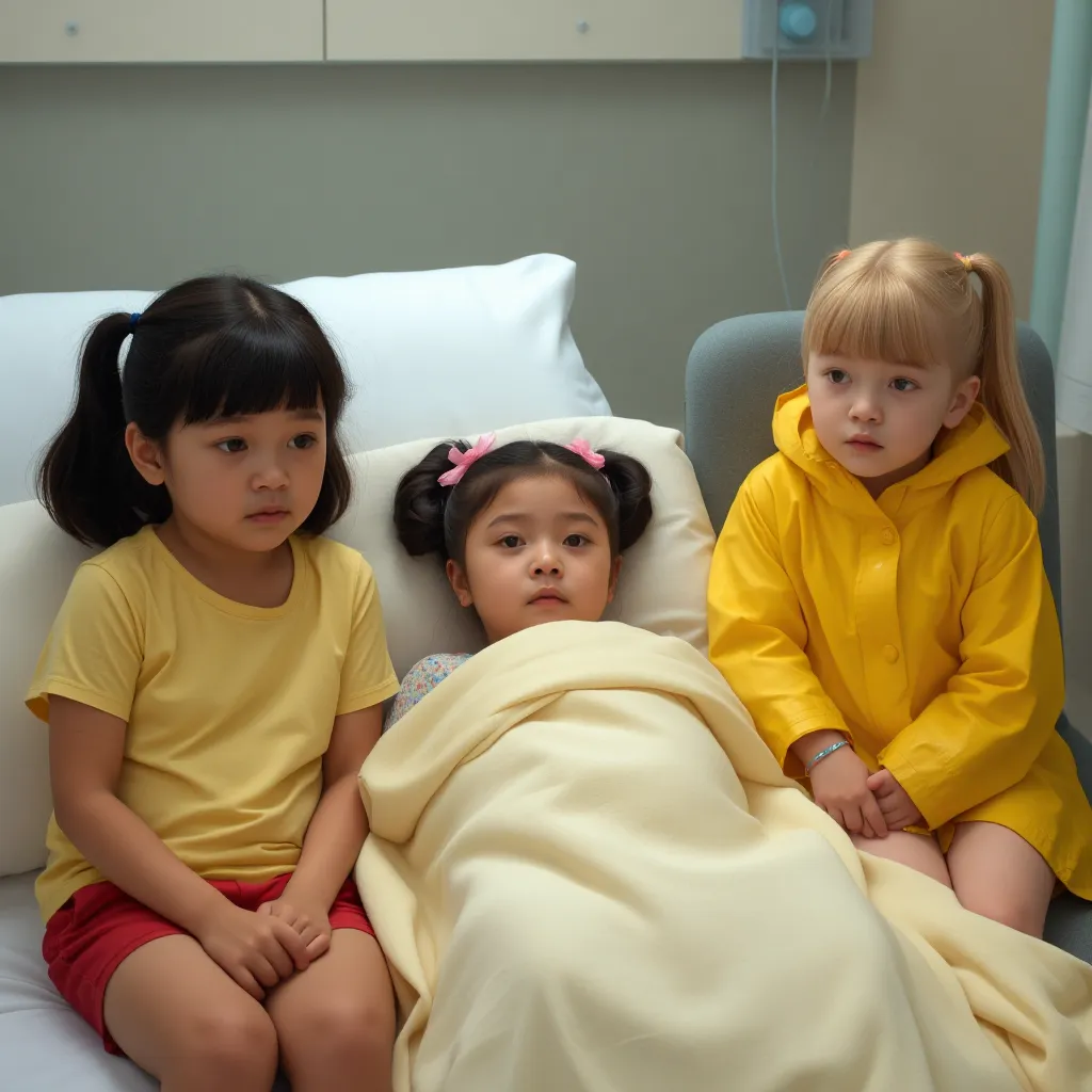 After spending time at the hospital, Daisy and Mei went over to Sofia’s home for a sleepover. The three friends, ever thoughtful and caring, agreed to wear their day outfits to sleep as a way to feel closer to Isabella and show their support. Mei kept on her yellow raincoat over blue shorts overalls and plain white t-shirt, and Daisy wore her bright, colorful t-shirt fading from red to yellow to green with brown pants and yellow raincoat. Sofia stayed in her plain yellow t-shirt, red shorts, and yellow boots. Together, they shared stories, hopes, and quiet moments, holding onto their friendship and the hope that Isabella would wake up soon.