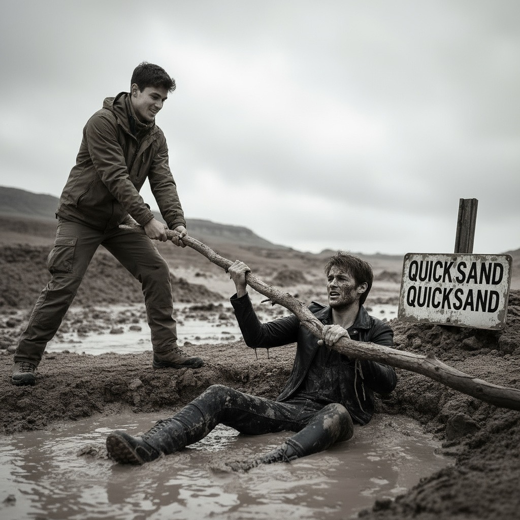 Given Nathan’s relatively calm demeanor, the presence of warning signage indicating a known danger zone, and the potential use of a cellphone for calling help, it is reasonable to conclude that Nathan likely escaped with help arriving soon after his call for assistance. His ability to remain still, combined with prompt rescue efforts, would have prevented him from sinking any further. Therefore, while the image captures a moment of peril, the broader context of quicksand rescues and emergency responses suggests that Nathan managed to get out safely without significant harm, thanks to his steady composure and timely aid.