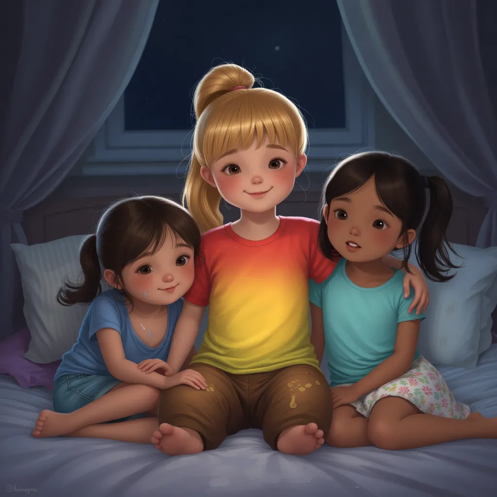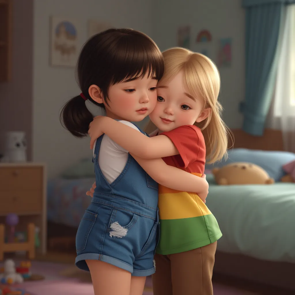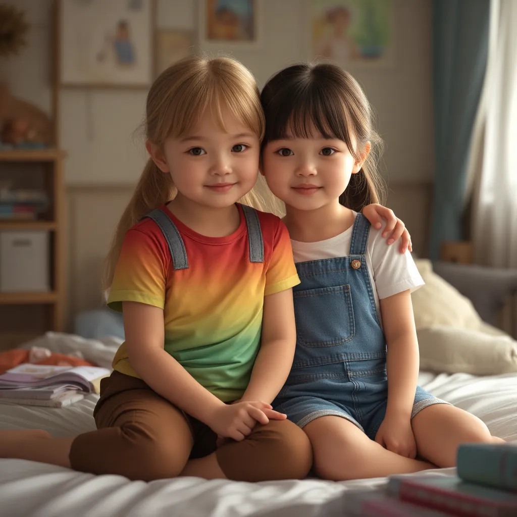 Daisy, a 6-year-old blonde girl with a ponytail in bangs, wore a bright and colorful t-shirt fading from red to yellow to green, paired with brown pants sits next to Mei, a cheerful 7-year-old Asian girl with shiny brunette hair falling just past her shoulders who wore blue shorts overalls over a plain white t-shirt on floor in bedroom, the girls are shown singing