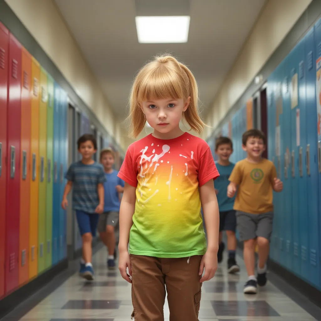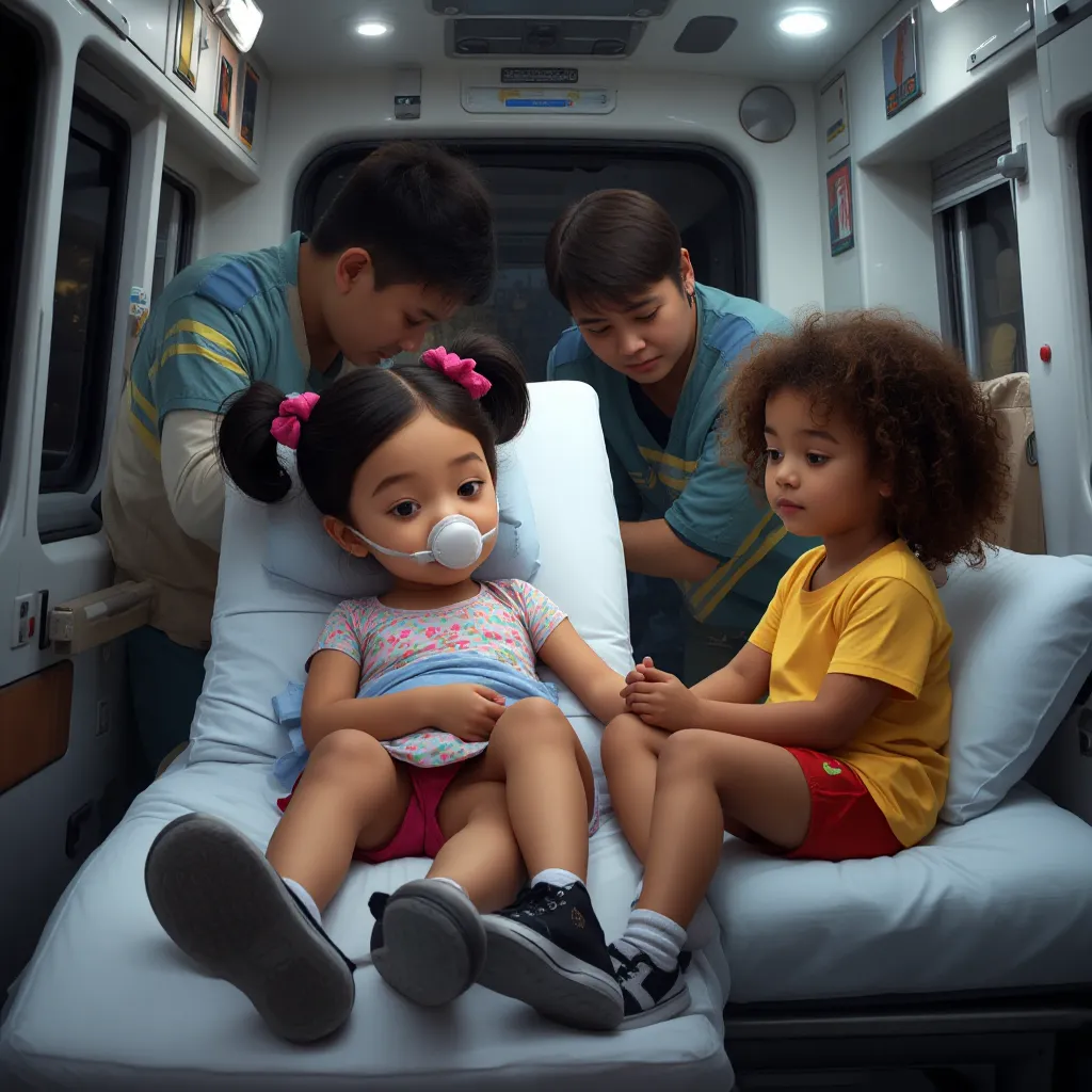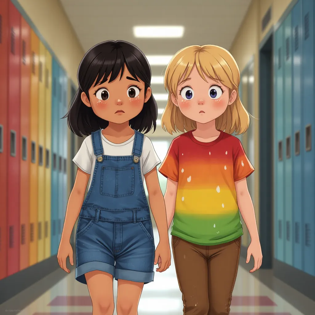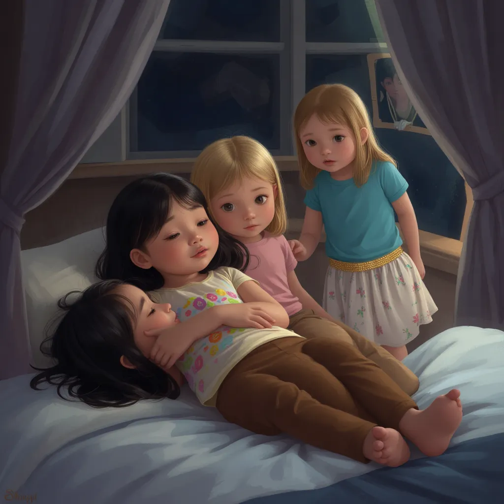 Daisy, a 6-year-old blonde girl with a ponytail in bangs, wore a bright and colorful t-shirt fading from red to yellow to green, paired with brown pants sits next to Mei, a cheerful 7-year-old Asian girl with shiny brunette hair falling just past her shoulders who wore blue shorts overalls over a plain white t-shirt on floor in bedroom, the girls are shown singing