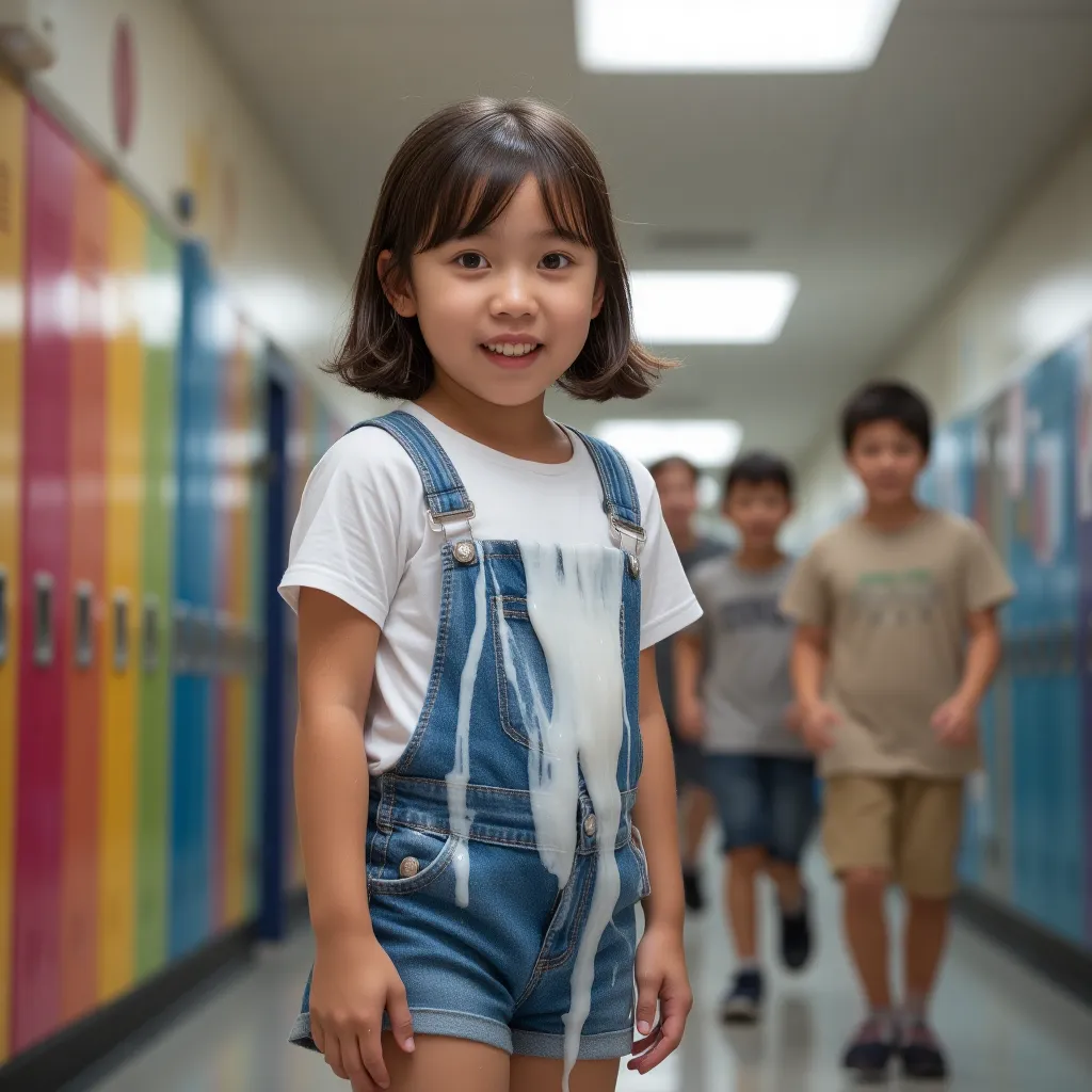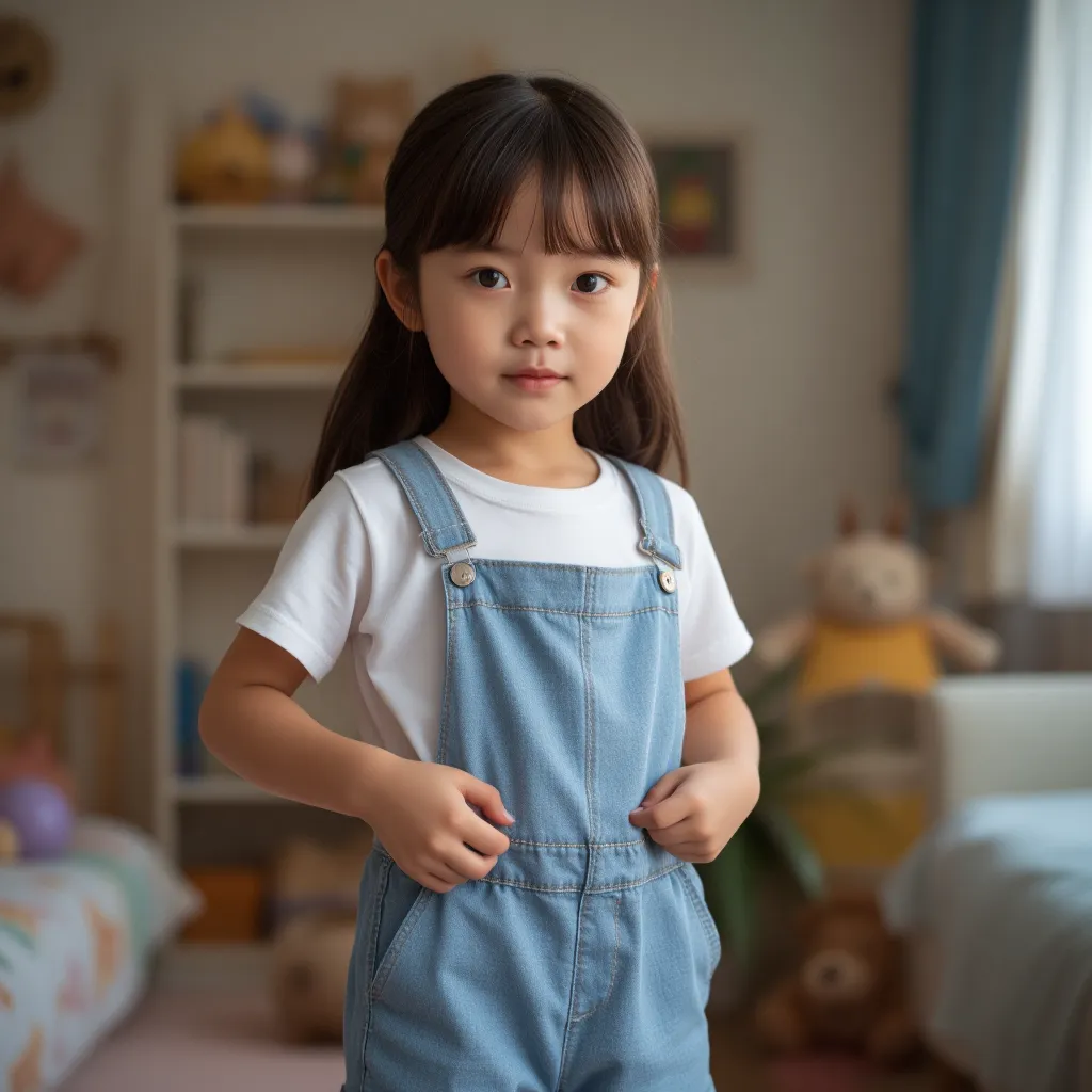 Daisy, a 6-year-old blonde girl with a ponytail in bangs, wore a bright and colorful t-shirt fading from red to yellow to green, paired with brown pants sits next to Mei, a cheerful 7-year-old Asian girl with shiny brunette hair falling just past her shoulders who wore blue shorts overalls over a plain white t-shirt on floor in bedroom, the girls are shown playing with their dolls