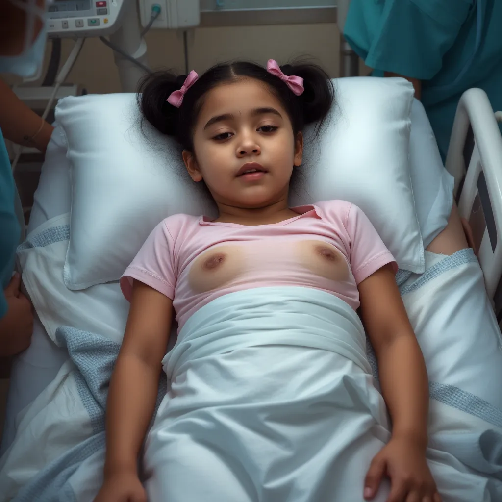 Sofia, an curly haired brunette 8-year-old Latina girl, sported a plain yellow t-shirt with red shorts sits next to Isabella, a 9-year-old Latina girl, had her ponytails in bangs with pink ribbon bows in them and wore light blue skirt overalls over a plain light pink t-shirt and had small gold hoop earrings on as well, on floor in bedroom, the girls are shown playing with their dolls